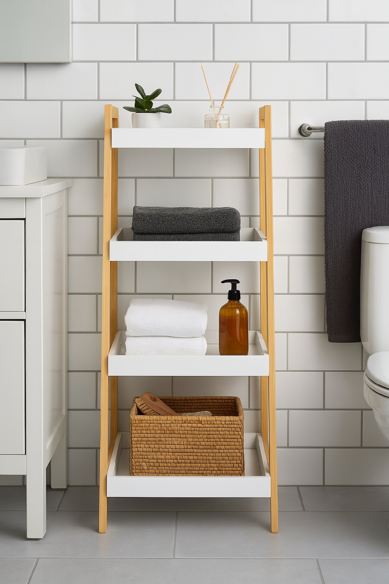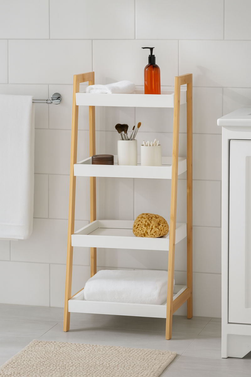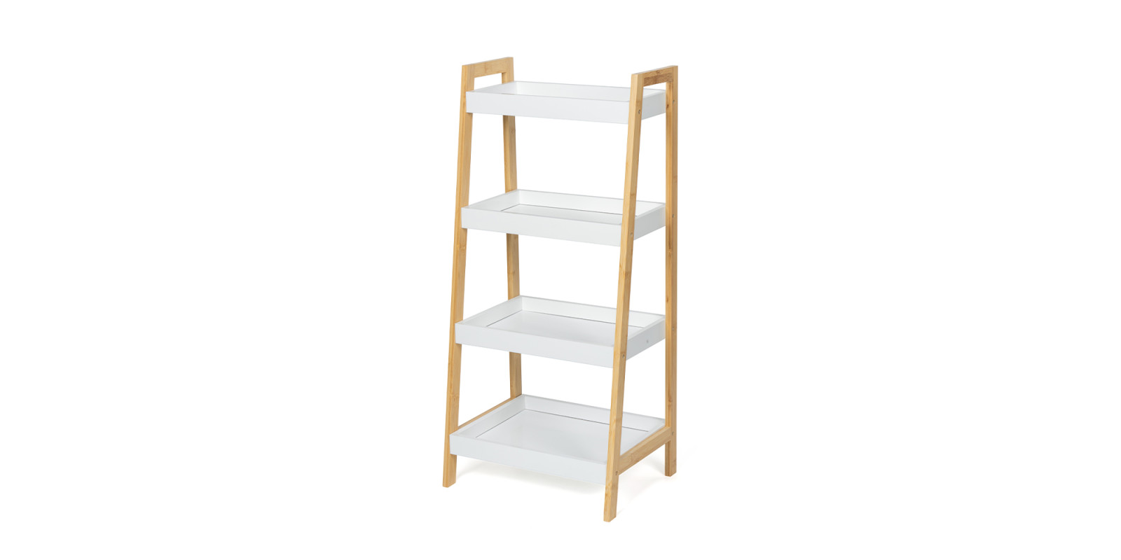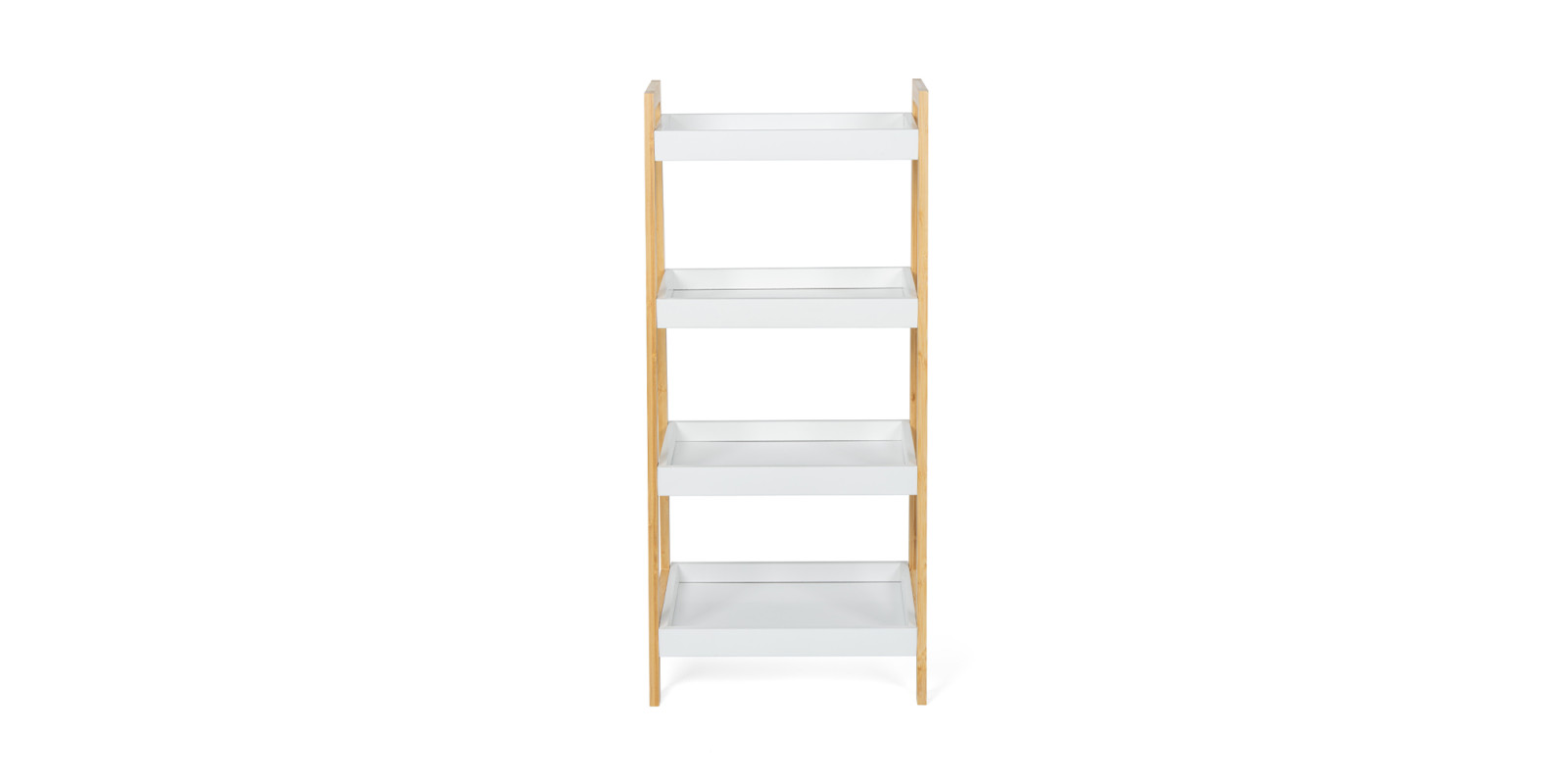 Designový policový díl se čtyřmi hlubšími policemi ve tvaru táců. Rám z přírodního bambusu dodává stabilitu a moderní vzhled. Bílé police s vyvýšenými okraji brání předmětům vypadnutí. Praktické řešení pro uložení dekorací, knih, ručníků nebo rostlin. Díky zkosené konstrukci působí odlehčeně a zapadne do moderních interiérů. Vhodný do obývacího pokoje, koupelny, ložnice i předsíně.