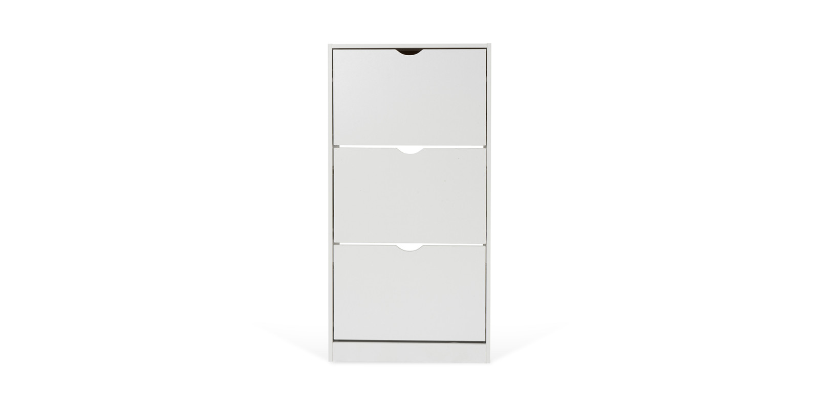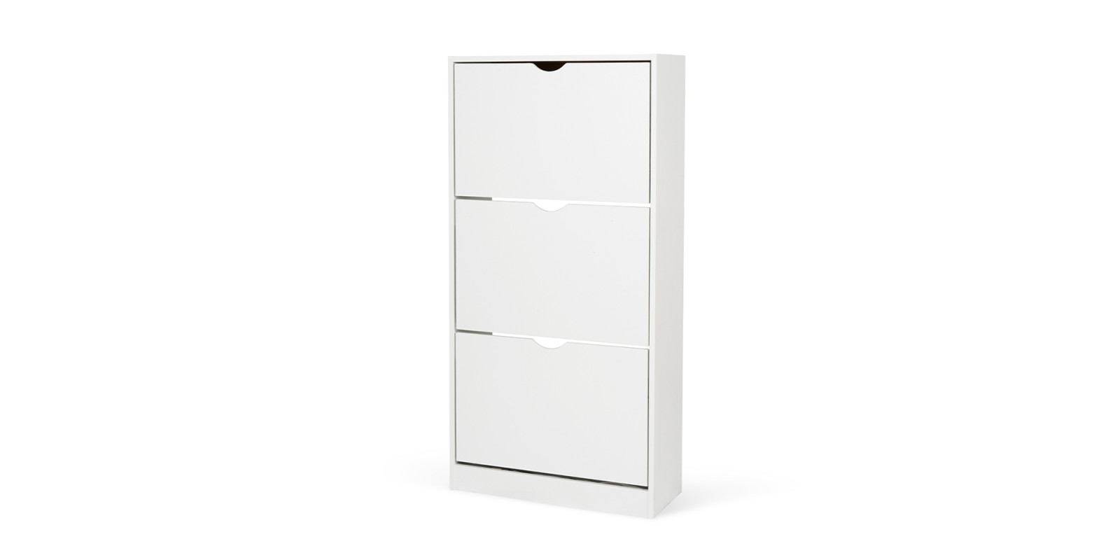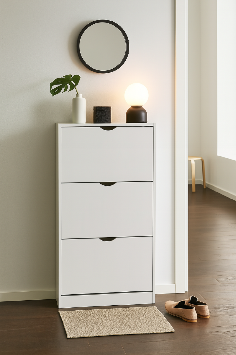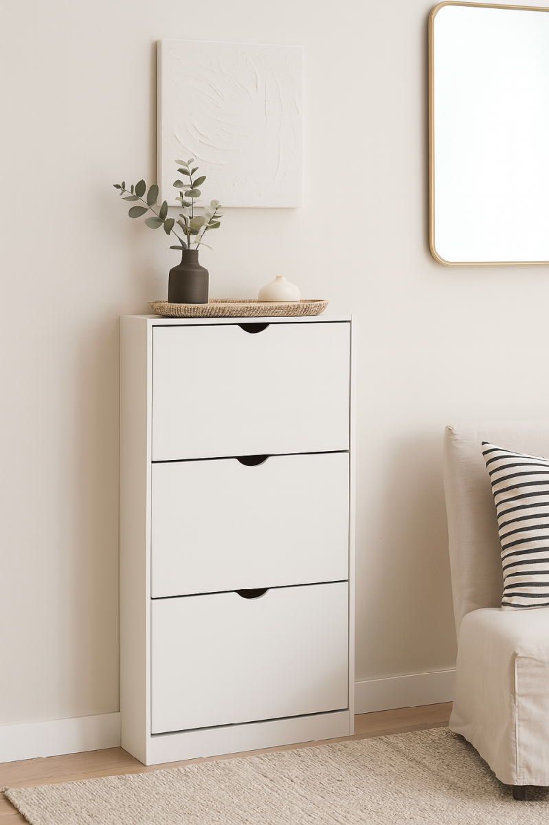 Botník s kompaktním a úzkým designem, ideální do menších prostor. Tři výklopné úložné prostory pro obuv. Jednoduché otevírání pomocí výřezů místo úchytek. Stabilní konstrukce pro každodenní používání. Moderní a minimalistický vzhled vhodný do předsíně či chodby.
