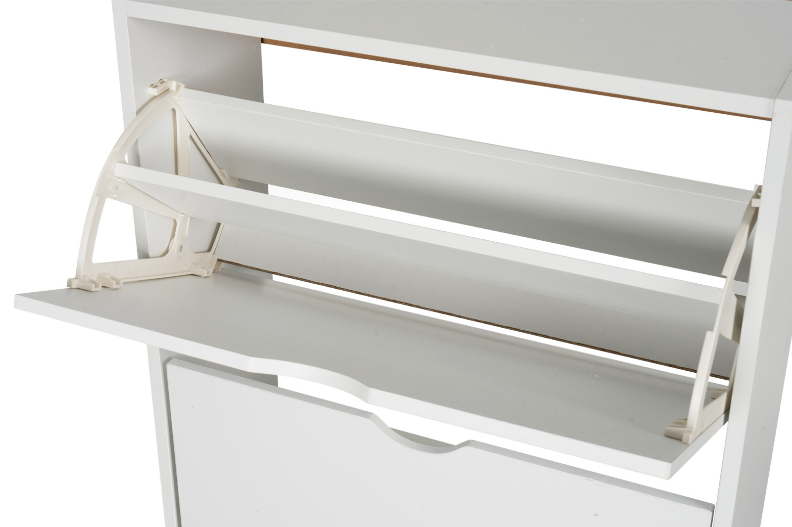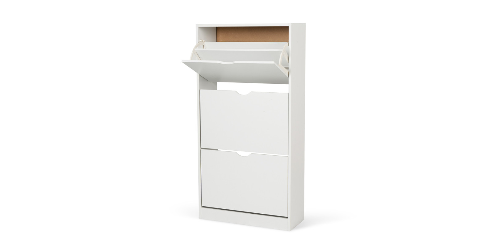 Botník z překližky v bílé barvě, tři výklopné přihrádky, bez zadní desky.