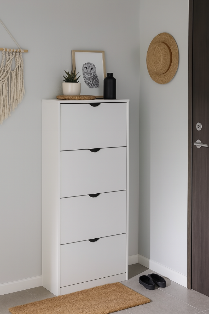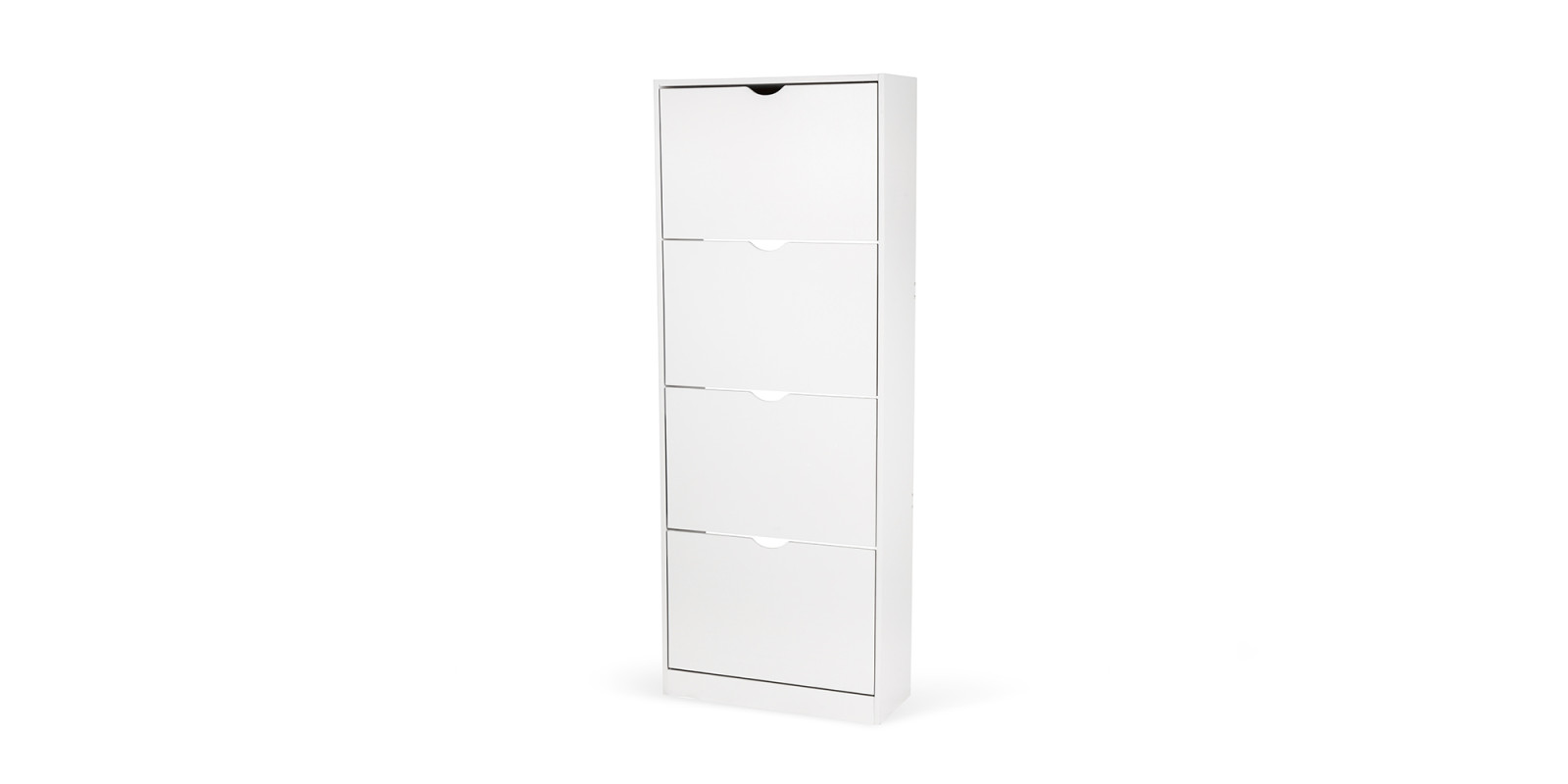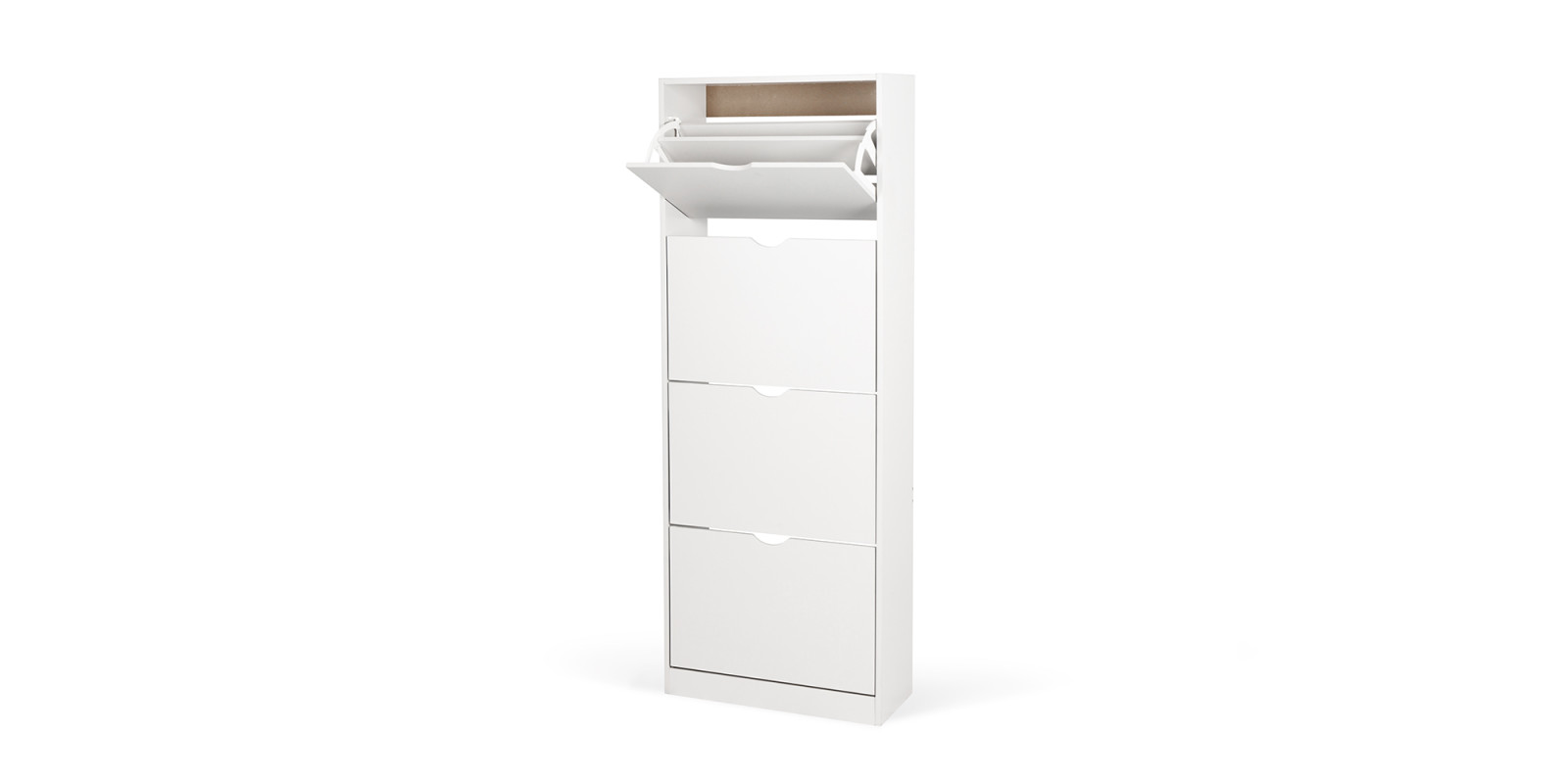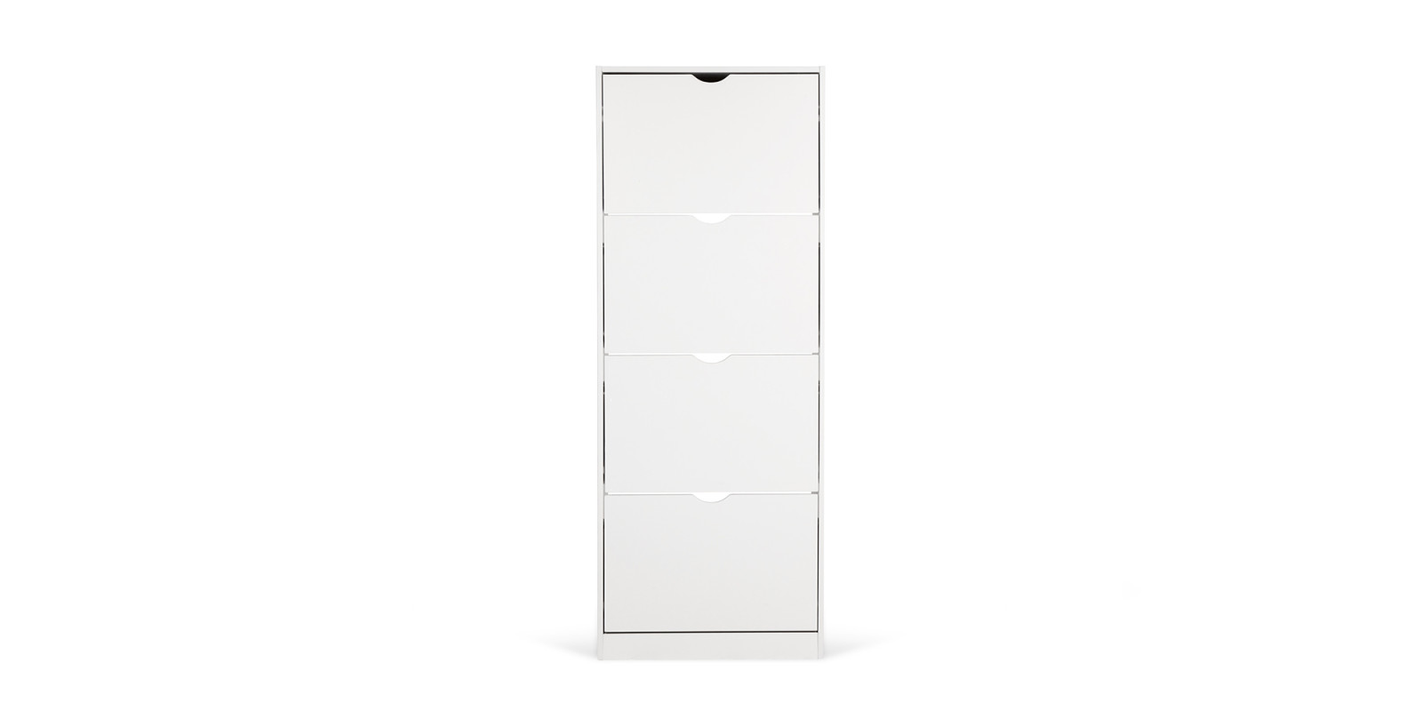 Botník s kompaktním a úzkým designem, ideální do menších prostor. Čtyři výklopné úložné prostory pro obuv. Jednoduché otevírání pomocí výřezů místo úchytek. Stabilní konstrukce pro každodenní používání. Moderní a minimalistický vzhled vhodný do předsíně či chodby.