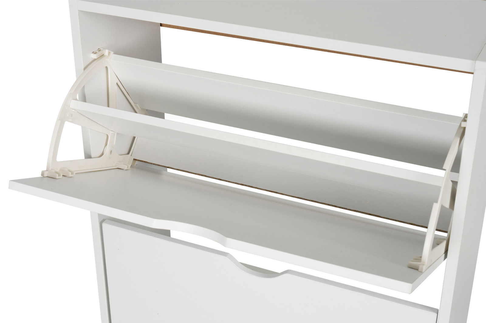 Botník z překližky v bílé barvě, čtyři výklopné přihrádky, bez zadní desky.
