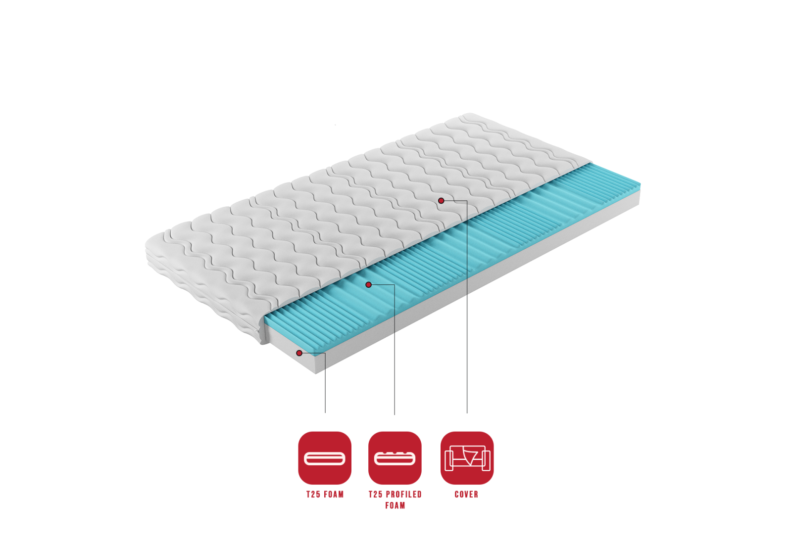 Oboustranná matrace CARL představuje nejoblíbenější typ pěnových matrací. Matrace je vyrobena z kvalitní polyuretanové pěny T25, která je na jedné straně potažena sedmizónovou profilovanou pěnou. Sedmizónová pěna s výjimečnými pracovními vlastnostmi zajišťuje komfort spánku bez ohledu na polohu při spánku. Matrace je rozdělena do 7 zón s různou tuhostí. Tyto zóny vytvoří rovnou linii páteře. Matrace má hypoalergenní vlastnosti. Antialergický prošívaný potah neabsorbuje alergeny, což je skvělé pro alergiky. Potah navíc můžete prát v pračce na 40 stupňů Celsia, což usnadňuje udržování správné spánkové hygieny. Potah má zip, díky kterému se snadno snímá a nasazuje. Model CARL je nejen pohodlný, ale také dostupný za atraktivní cenu.