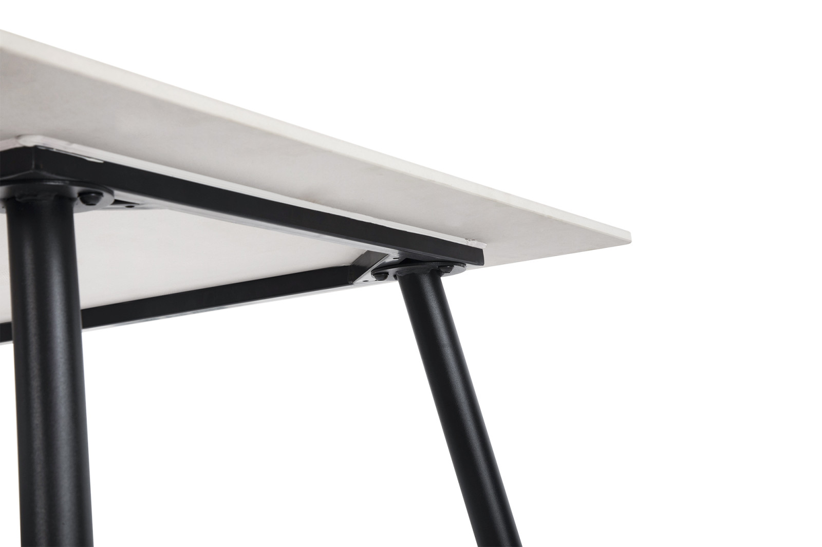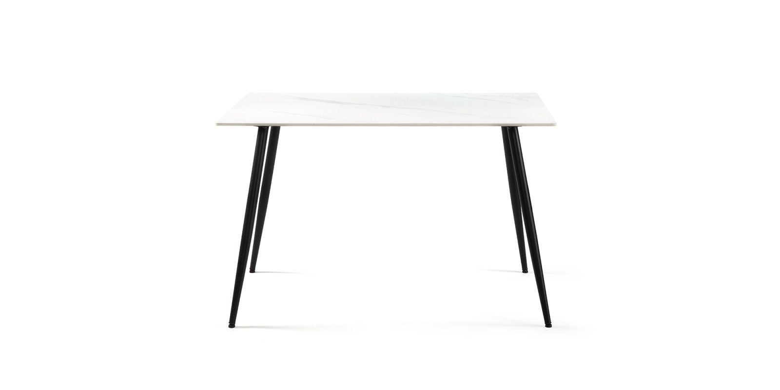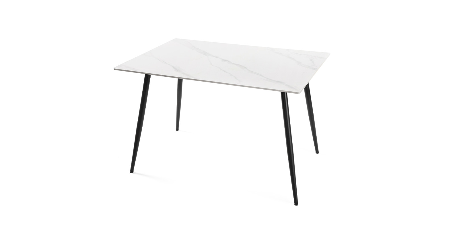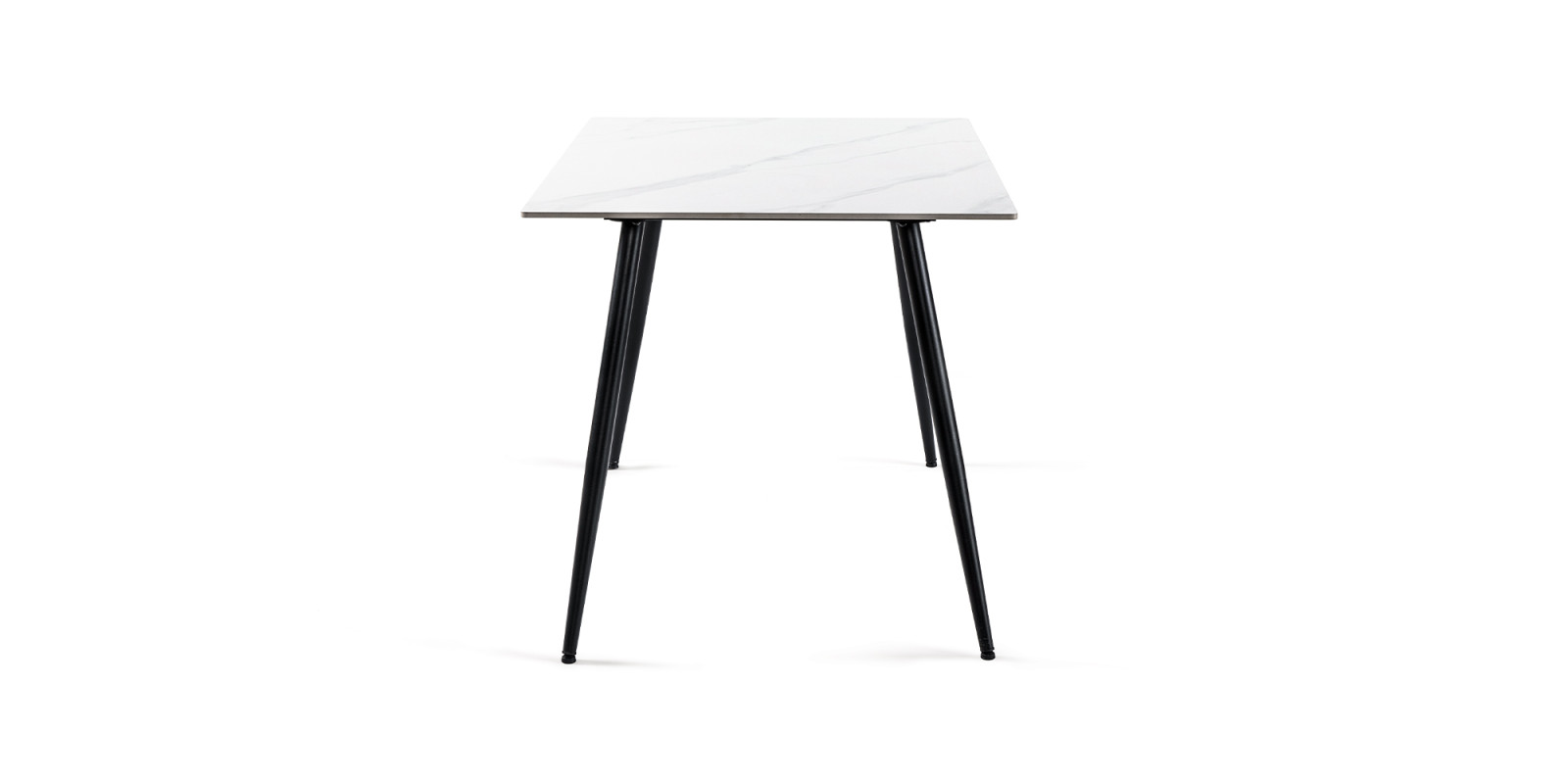Keramická deska v bílé barvě s mramorovým dekorem s ocelovými nohy v barvě černé .