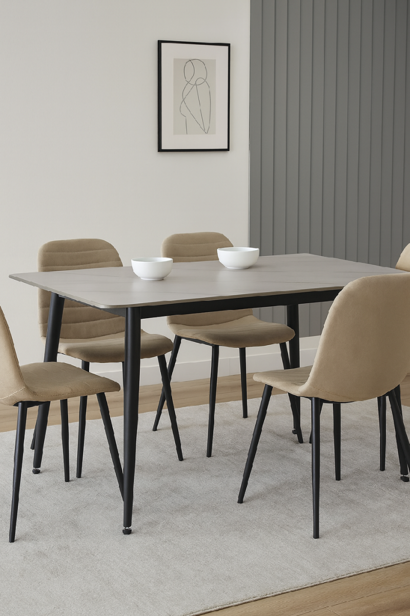 Elegantní jídelní stůl s moderním minimalistickým designem. Deska v bílé barvě s mramorovým dekorem působí luxusně a nadčasově. Stabilní kovové nohy v černém provedení. Vhodný do jídelny, kuchyně i menších interiérů. Spojuje praktičnost, odolnost a stylový vzhled.