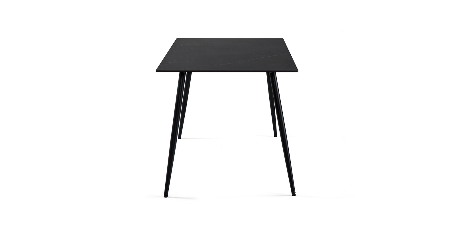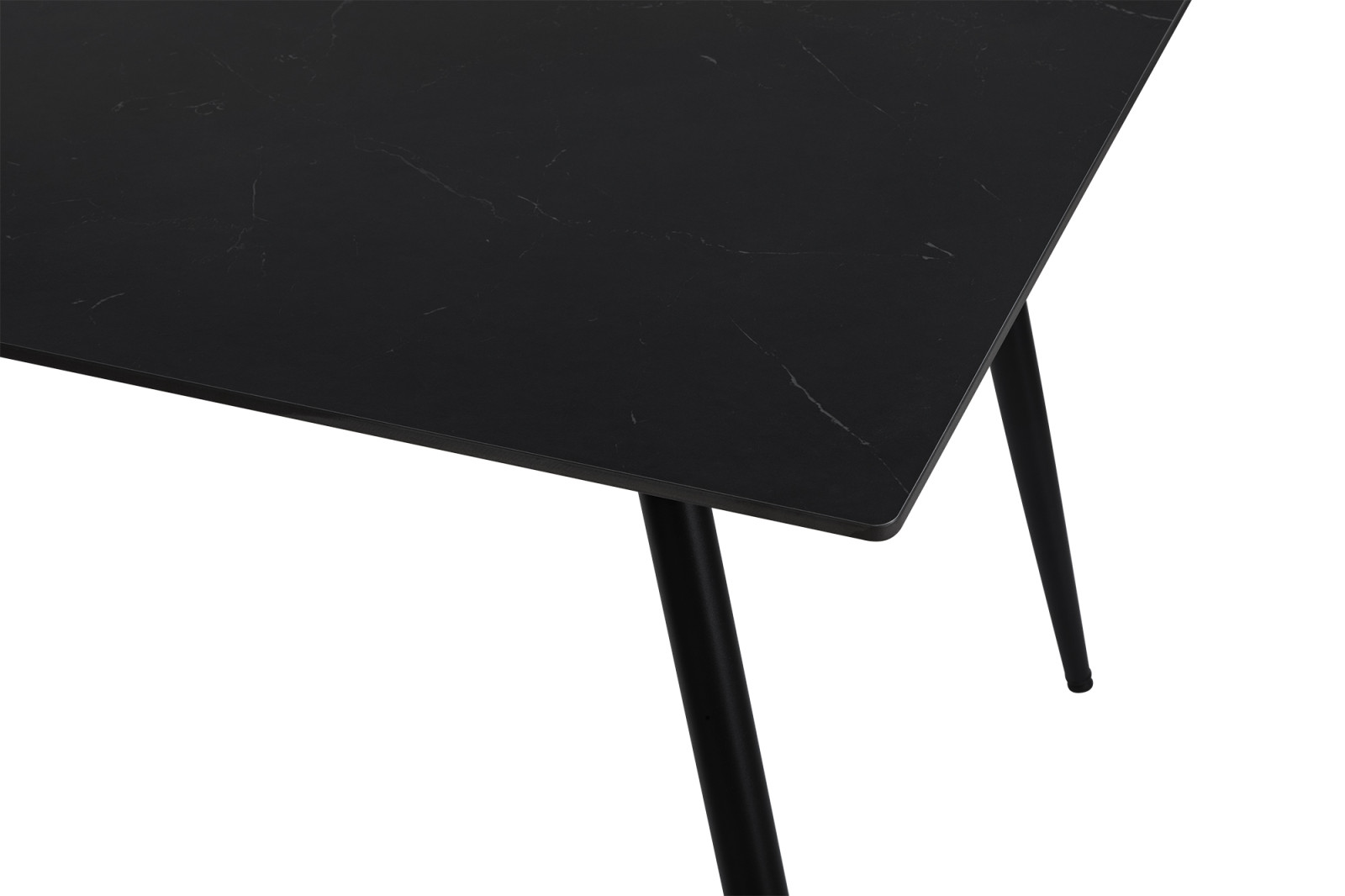 Elegantní jídelní stůl s moderním minimalistickým designem. Deska v černé barvě s mramorovým dekorem působí luxusně a nadčasově. Stabilní kovové nohy v černém provedení. Vhodný do jídelny, kuchyně i menších interiérů. Spojuje praktičnost, odolnost a stylový vzhled.