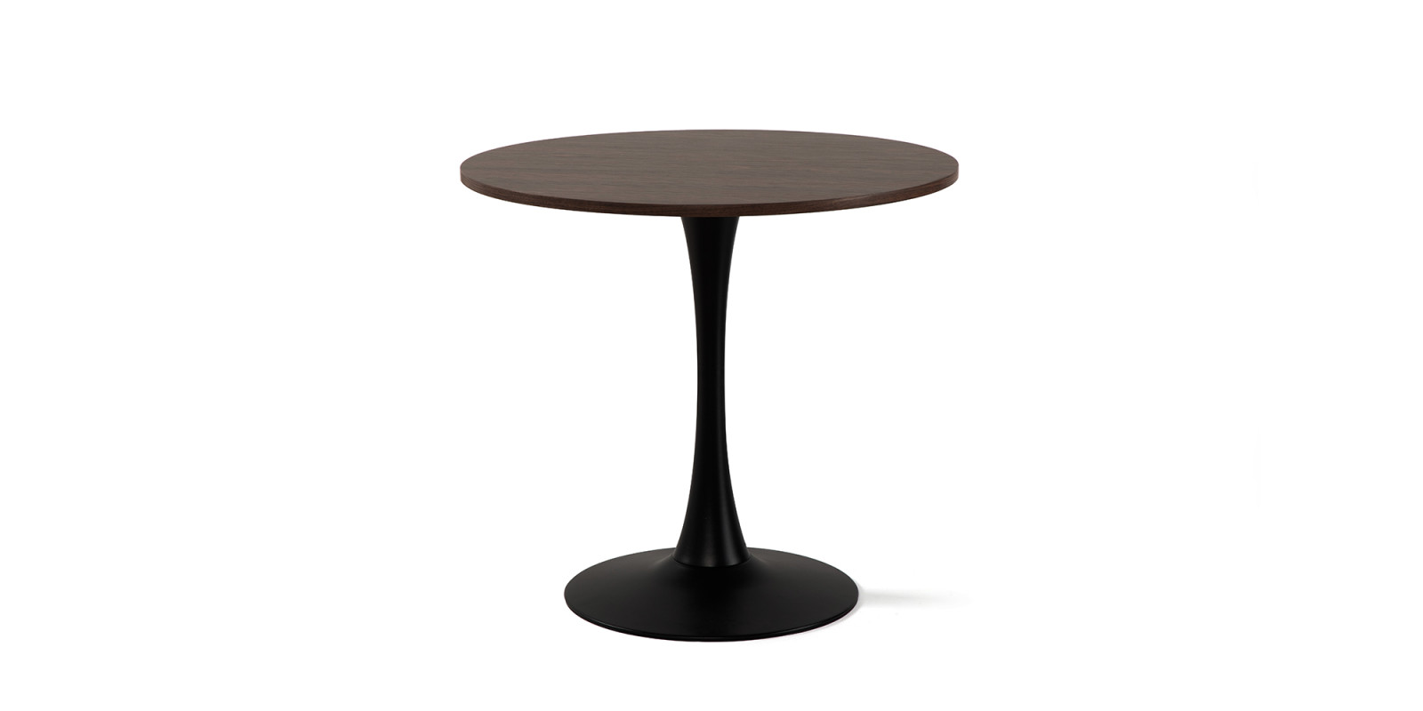 Stolová MDF deska s texturou dřeva v hnědé barvě o průměru 80cm, práškované ocelové podnoží.