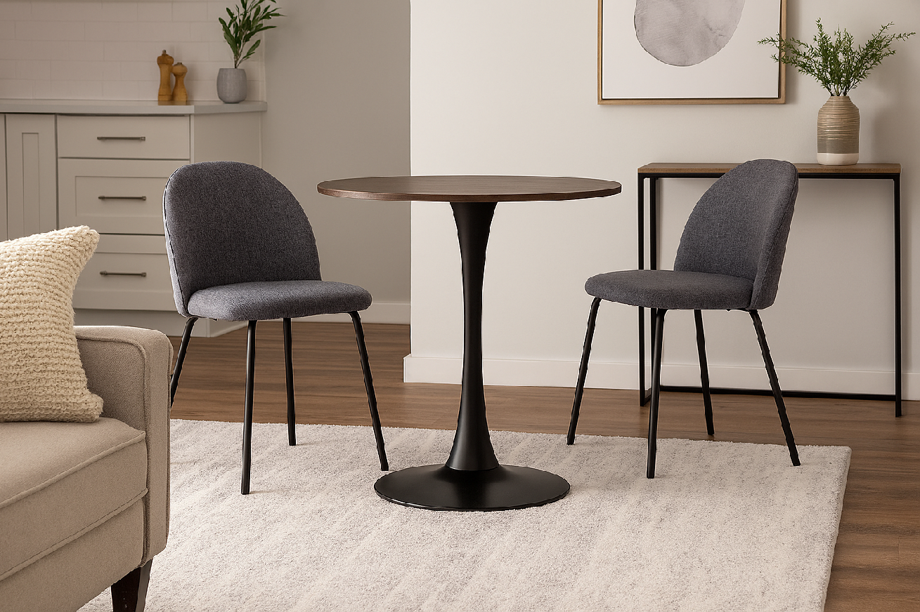 Kulatá MDF deska v dekoru tmavého dřeva dodává interiéru teplo, zatímco centrální kovová noha v černém matném provedení zajišťuje stabilitu a moderní vzhled.