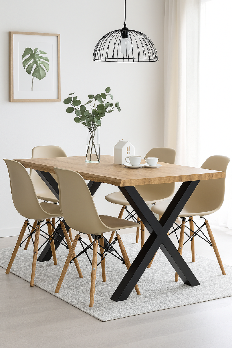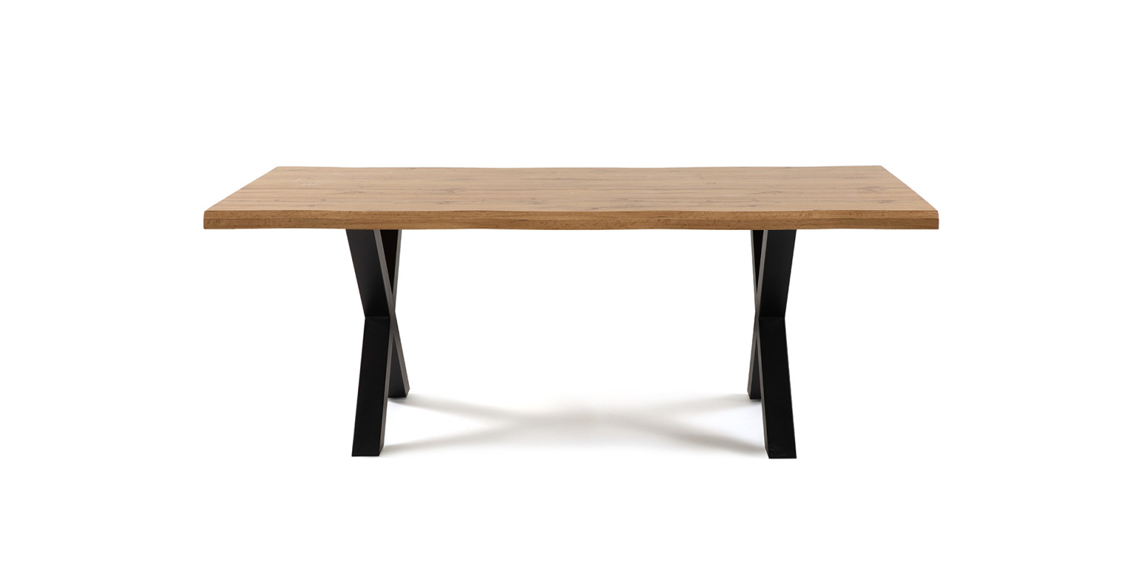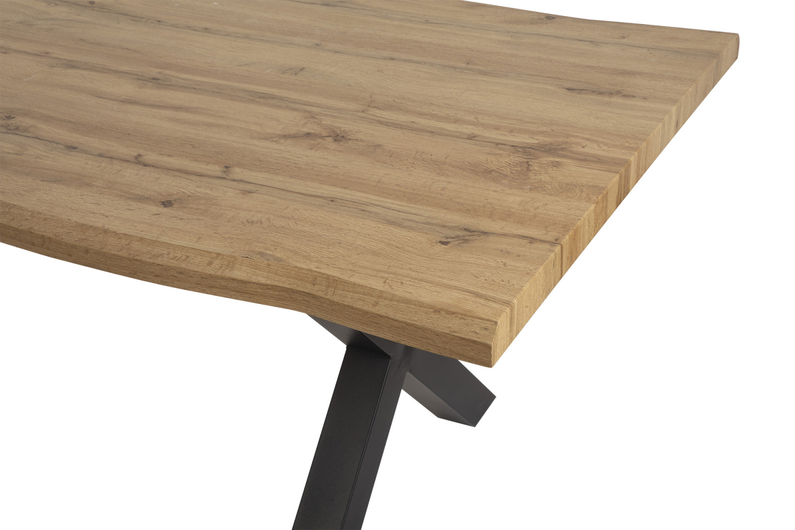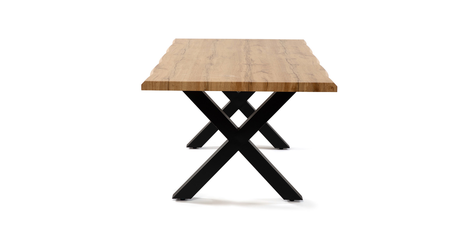 Moderní jídelní stůl s industriálním designem. Stolová deska v přírodním dekoru dřeva s výraznou kresbou. Robustní kovová podnož v černém provedení ve tvaru „X“. Ideální do prostorné jídelny či moderní kuchyně. Spojuje odolnost, praktičnost a stylový vzhled.
