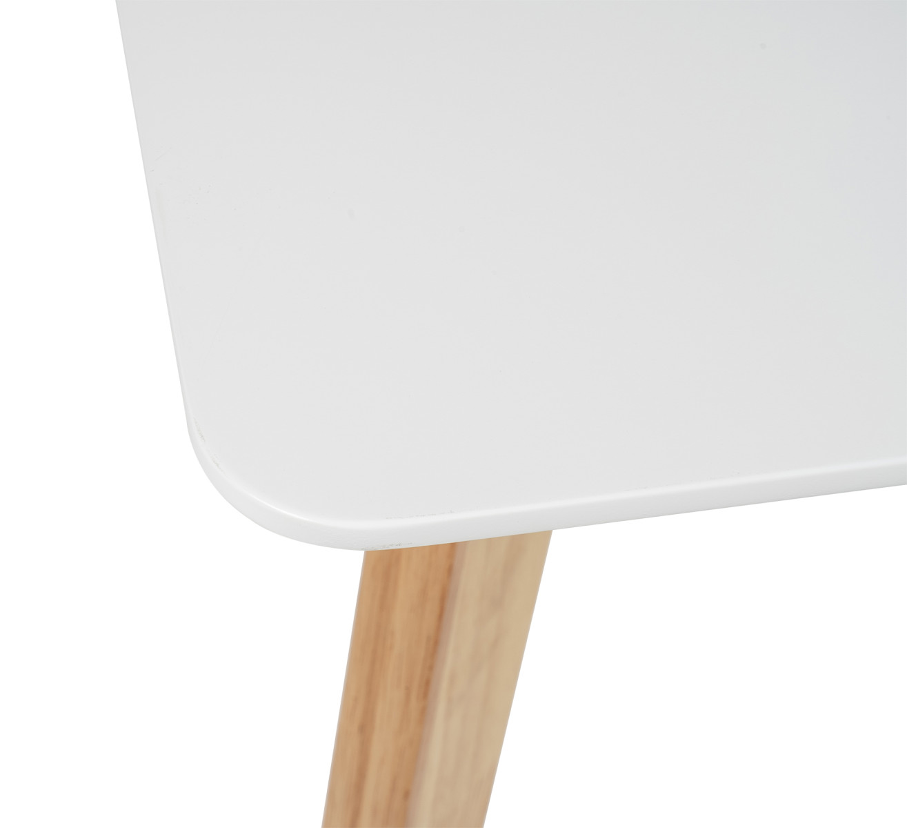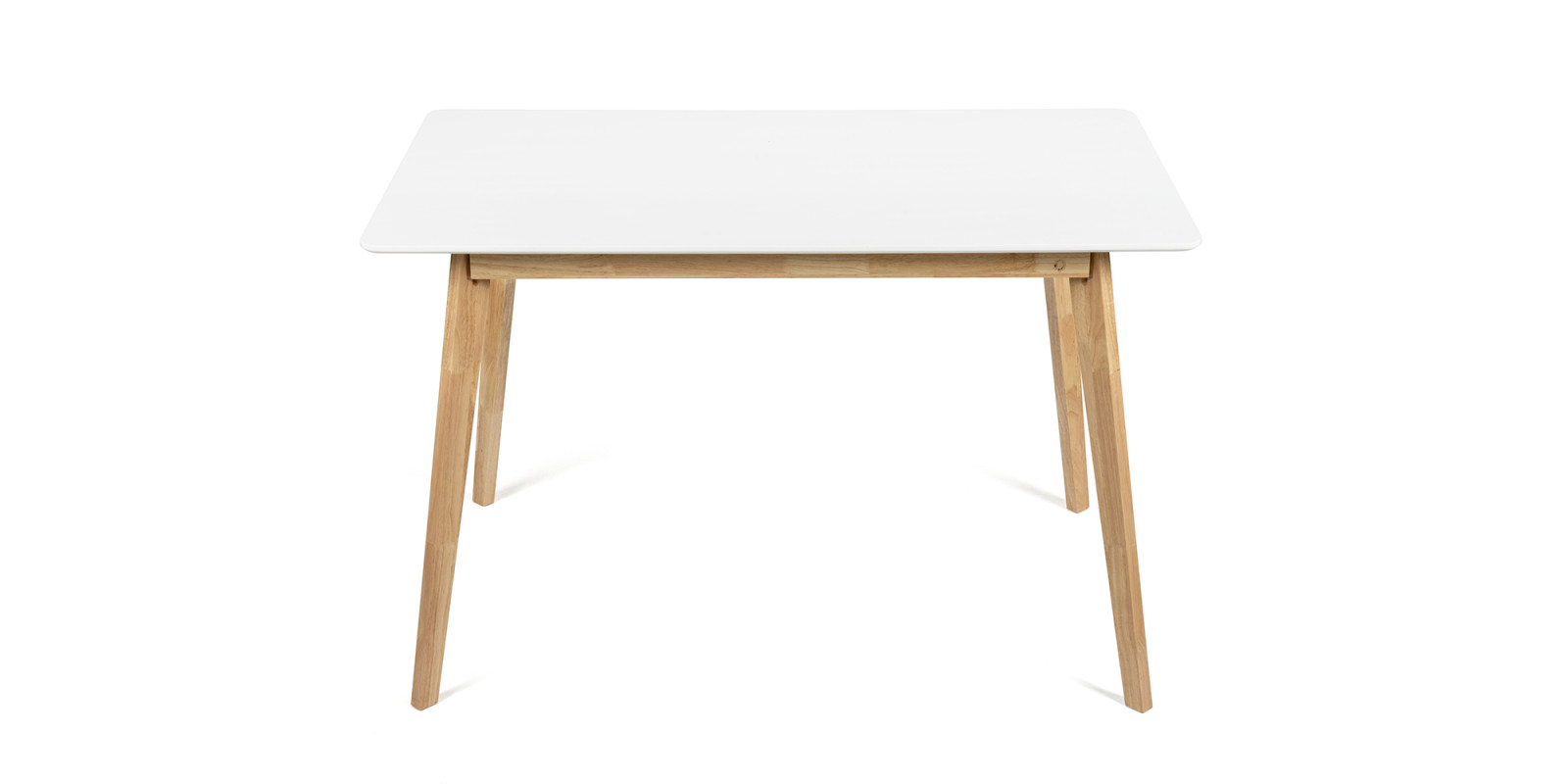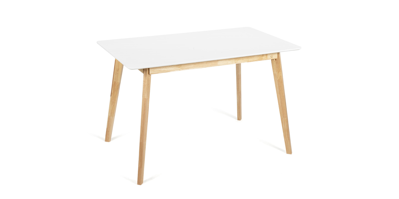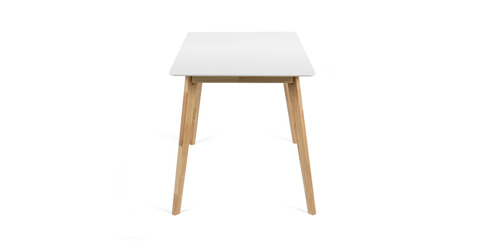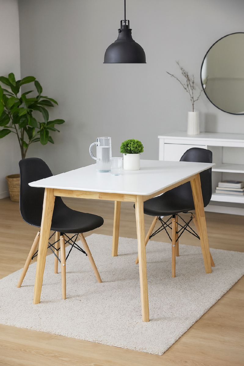 Obdélníkový jídelní stůl s moderním skandinávským designem. Bílá stolová deska dodává interiéru čistý a elegantní vzhled. Stabilní nohy z přírodního dřeva pro hřejivý dojem. Vhodný do jídelny, kuchyně či menších bytových prostor. Spojuje jednoduchost, praktičnost a nadčasový styl.