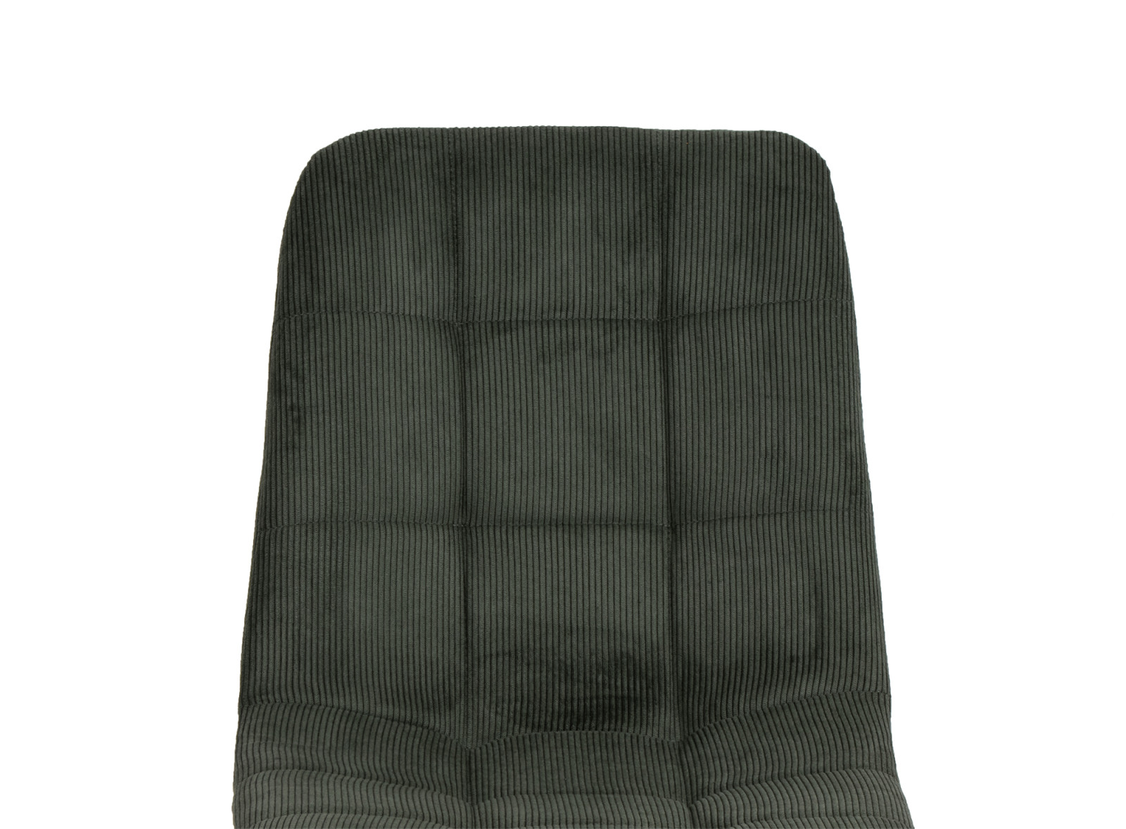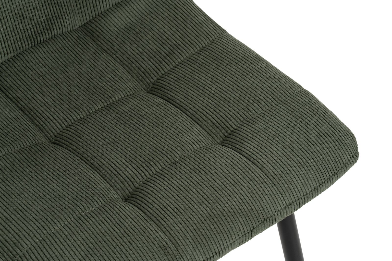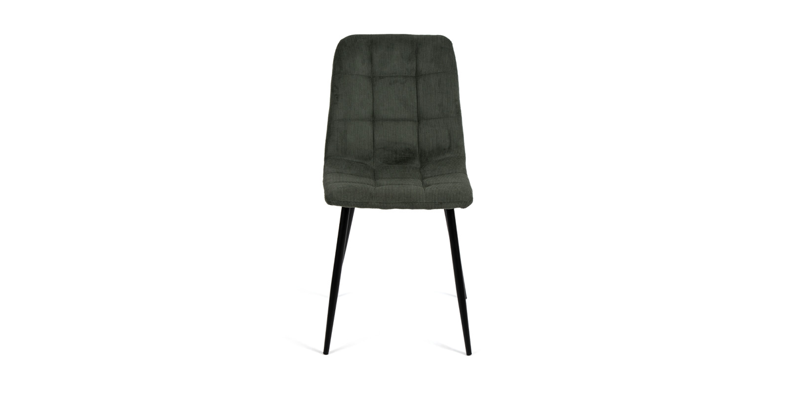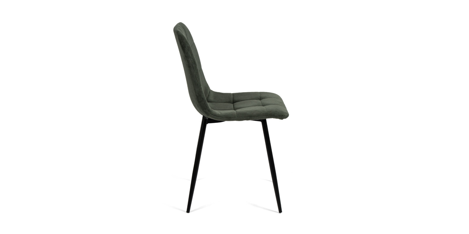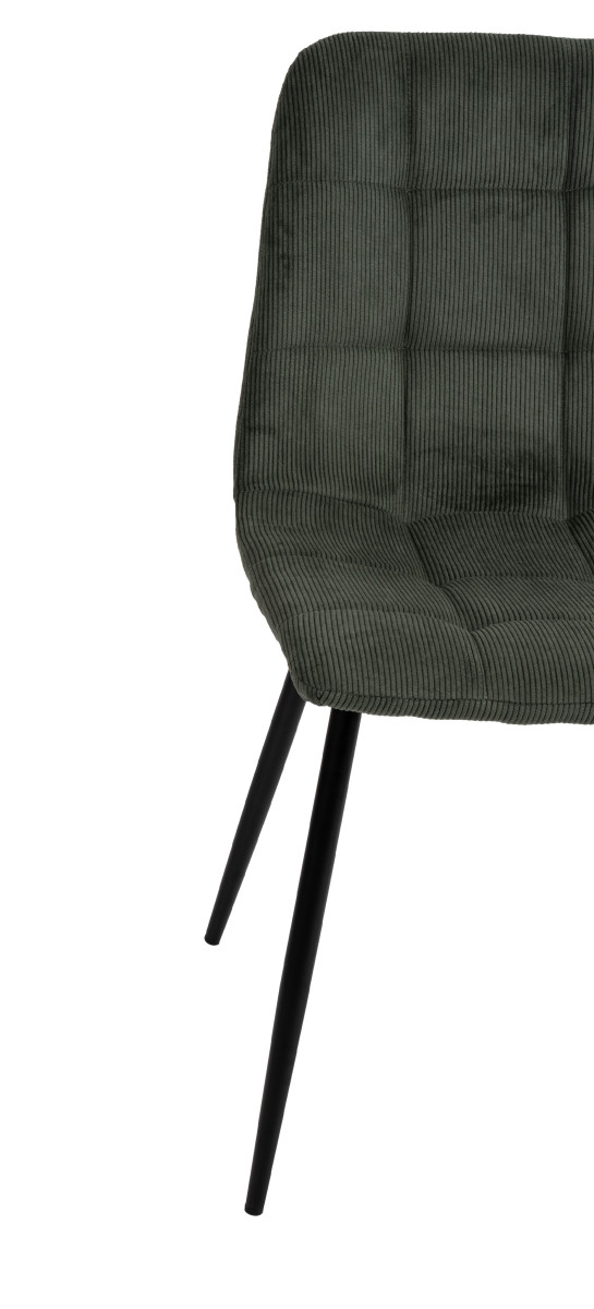 Moderní židle s elegantním designem. Pohodlné čalounění v zelené manšestrové látce s prošíváním. Stabilní kovové nohy v černém provedení. Ideální do jídelny, obývacího pokoje i pracovny. Kombinace komfortu, odolnosti a stylového vzhledu.