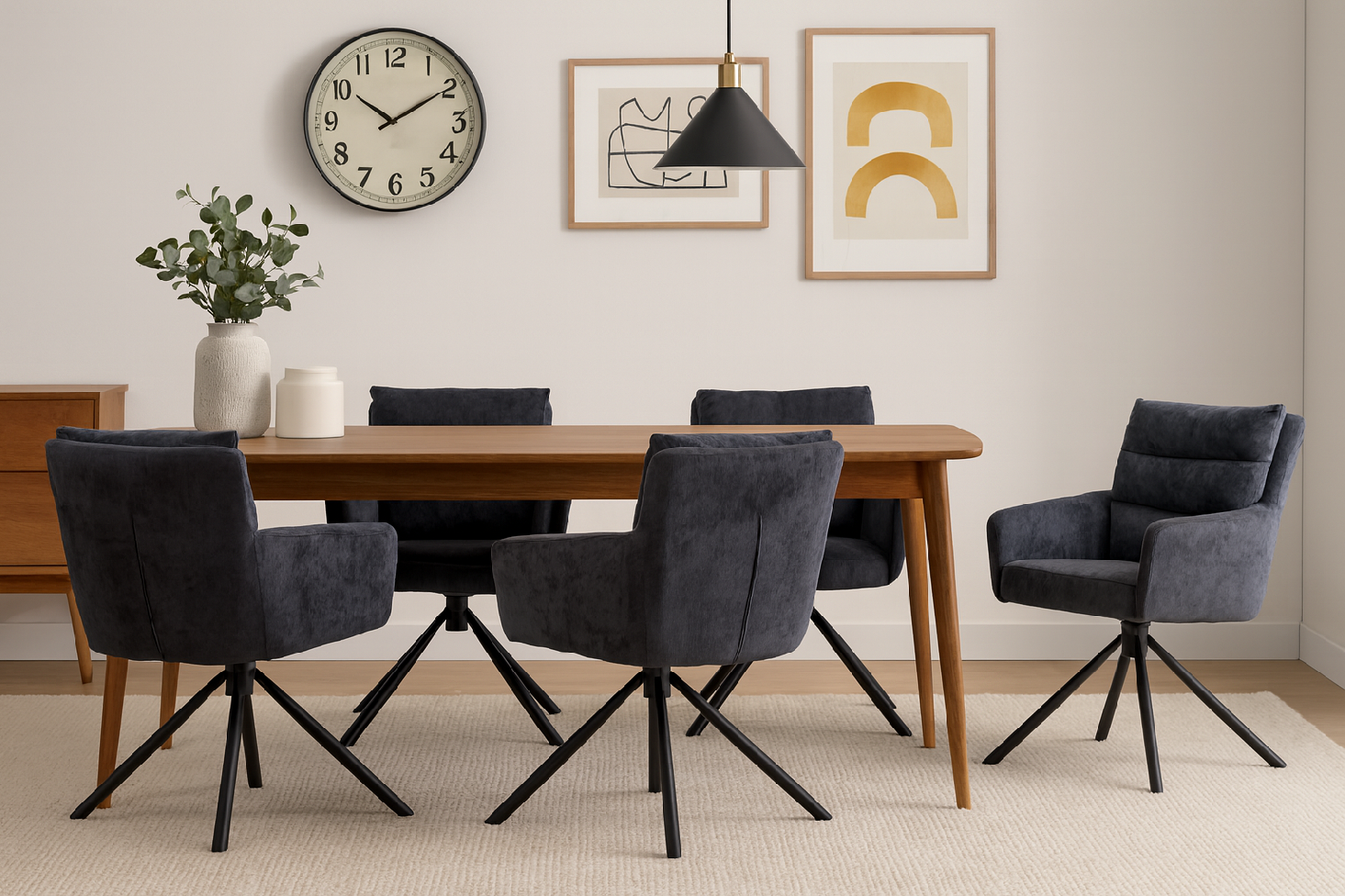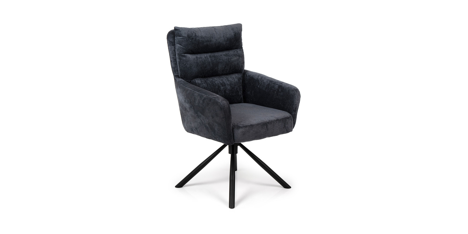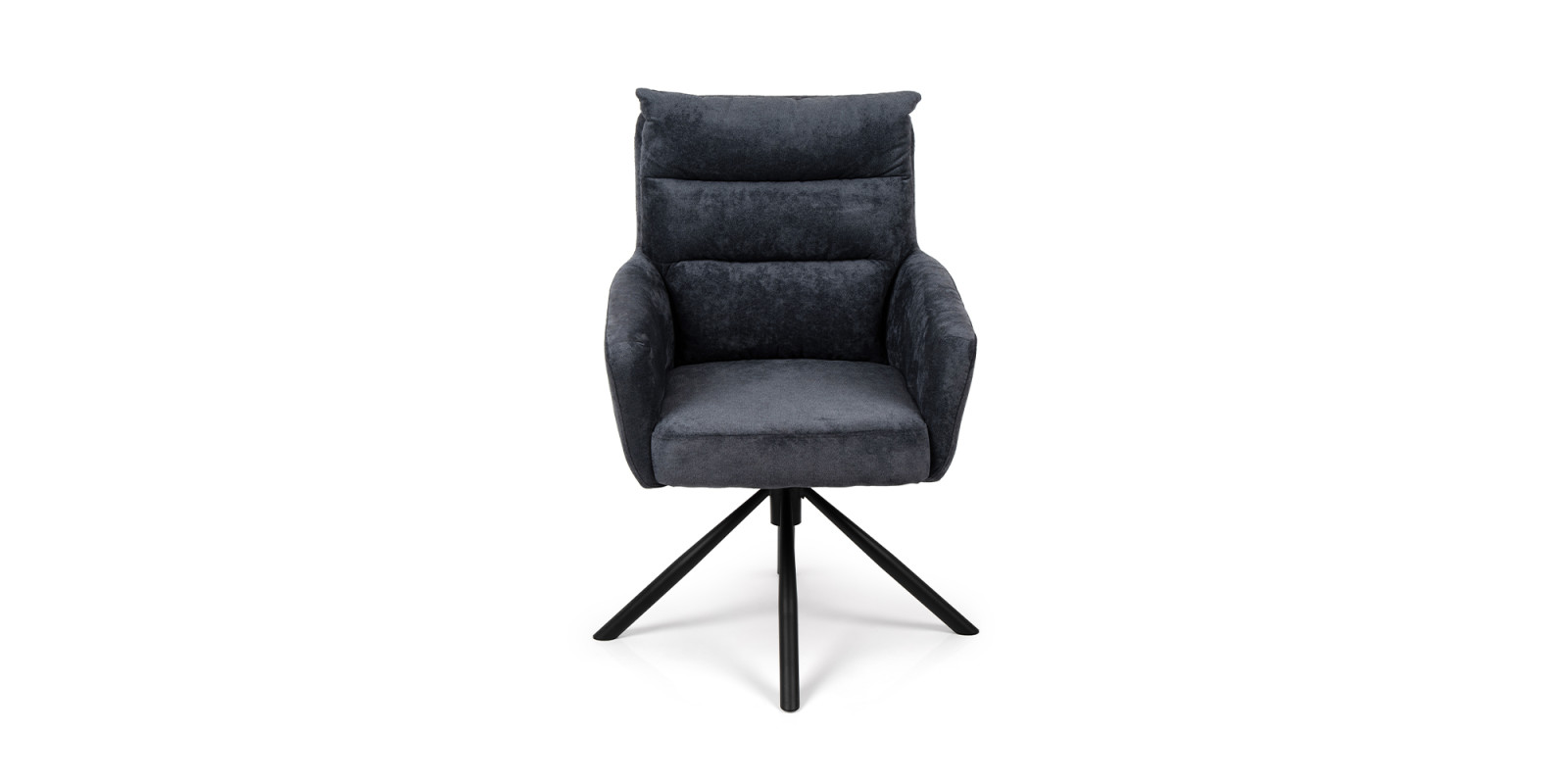 Moderní židle s područkami a elegantním vzhledem. Pohodlné čalounění v tmavě šedé látce s měkkým polstrováním. Stabilní kovová podnož s otočnou funkcí. Skvěle se hodí do jídelny, pracovny i kanceláře. Spojuje komfort, praktičnost a stylový design.