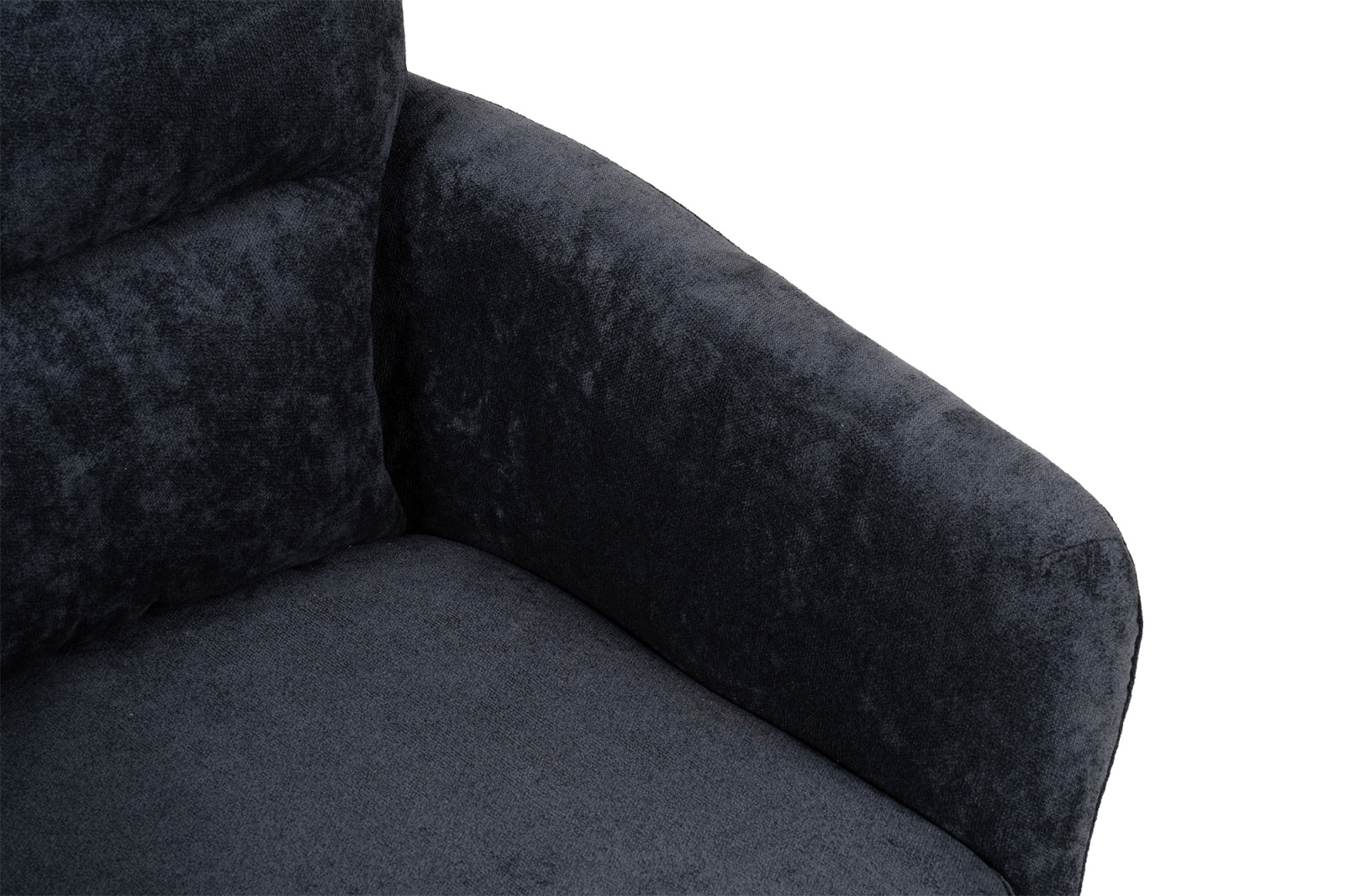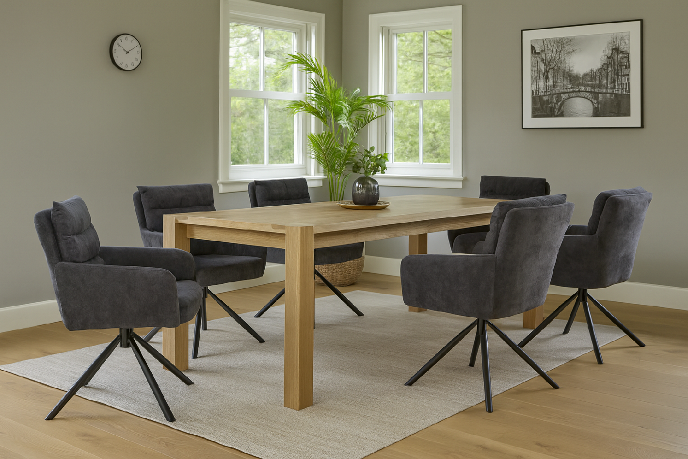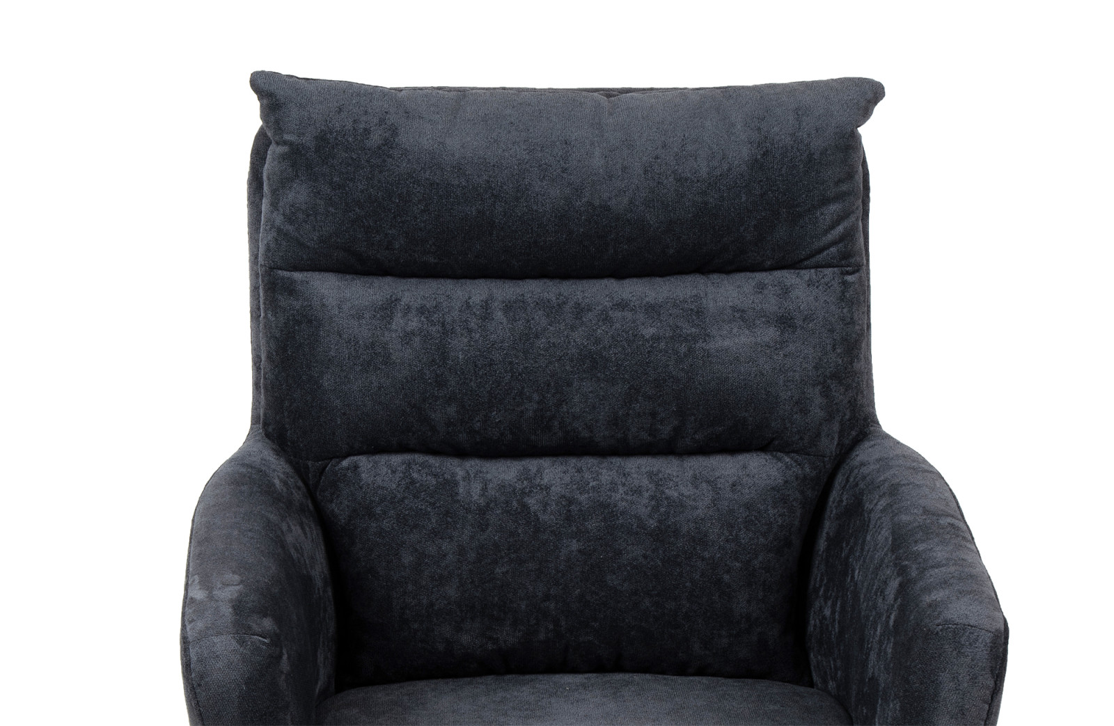 Moderní židle s područkami a elegantním vzhledem. Pohodlné čalounění v tmavě šedé látce s měkkým polstrováním. Stabilní kovová podnož s otočnou funkcí. Skvěle se hodí do jídelny, pracovny i kanceláře. Spojuje komfort, praktičnost a stylový design.