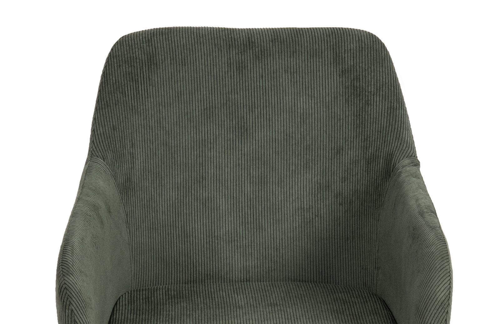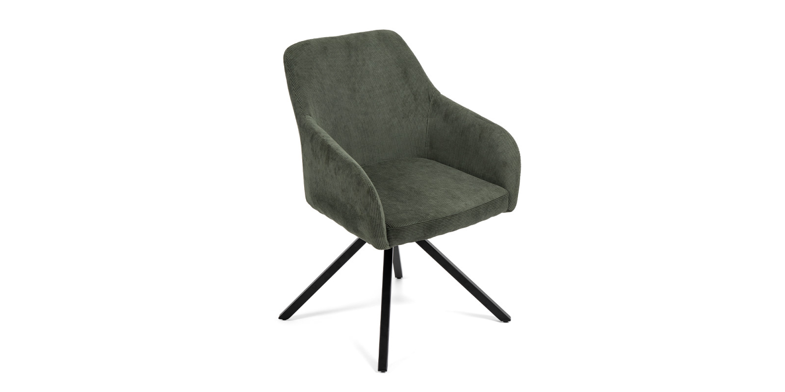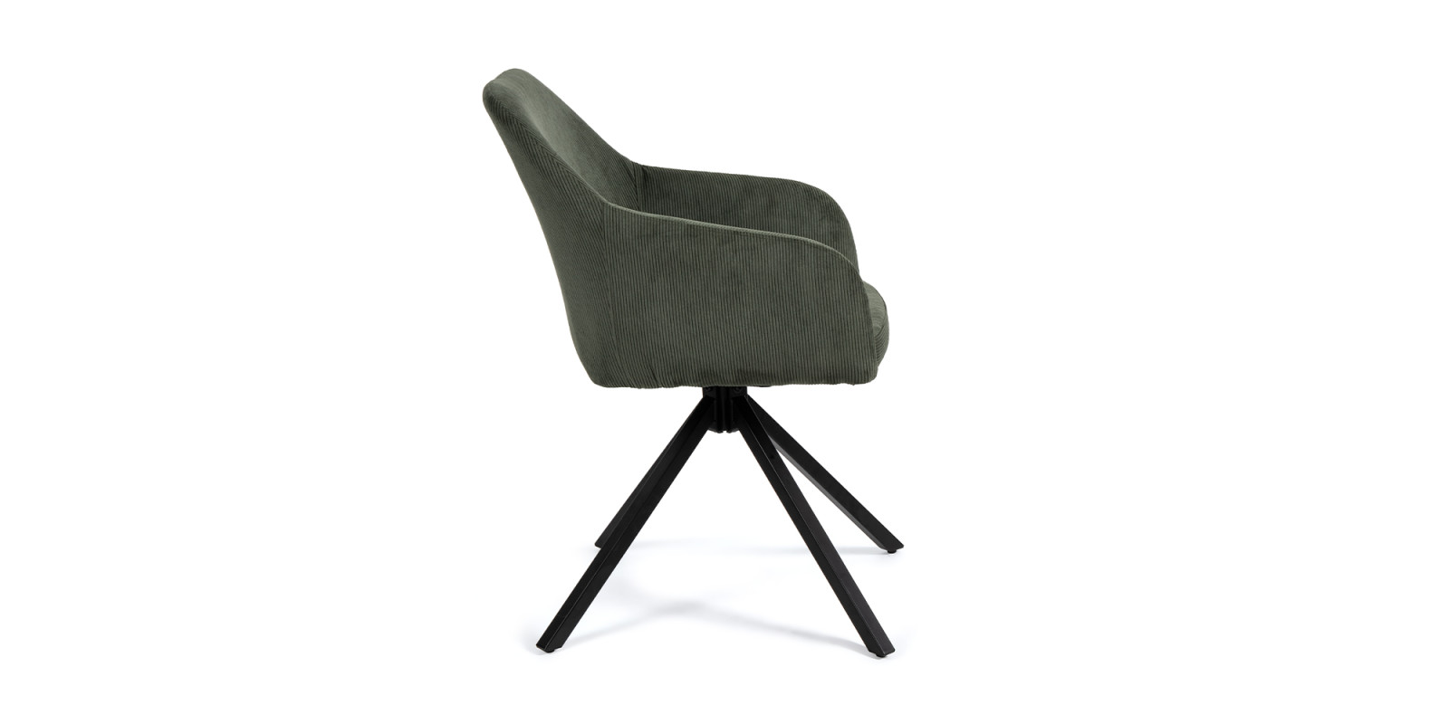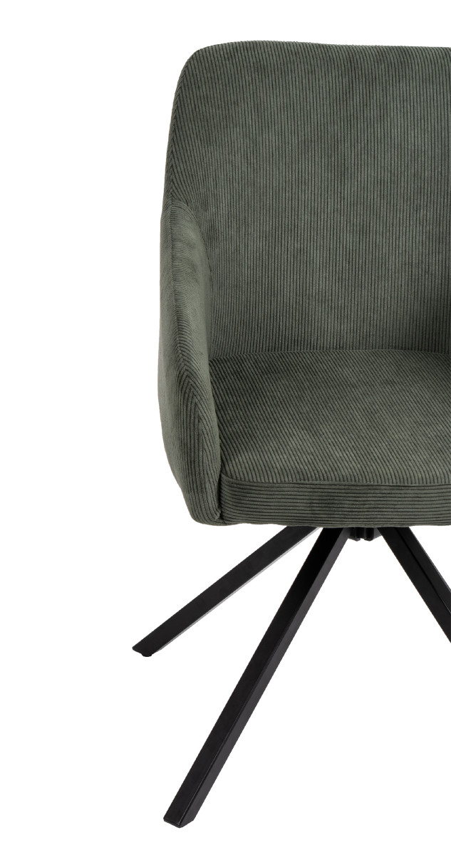 Stylová židle s područkami a moderním designem. Pohodlné čalounění v zelené manšestrové látce. Stabilní kovová podnož s otočnou funkcí. Vhodná do jídelny, pracovny i kanceláře. Spojuje komfort, praktičnost a elegantní vzhled.