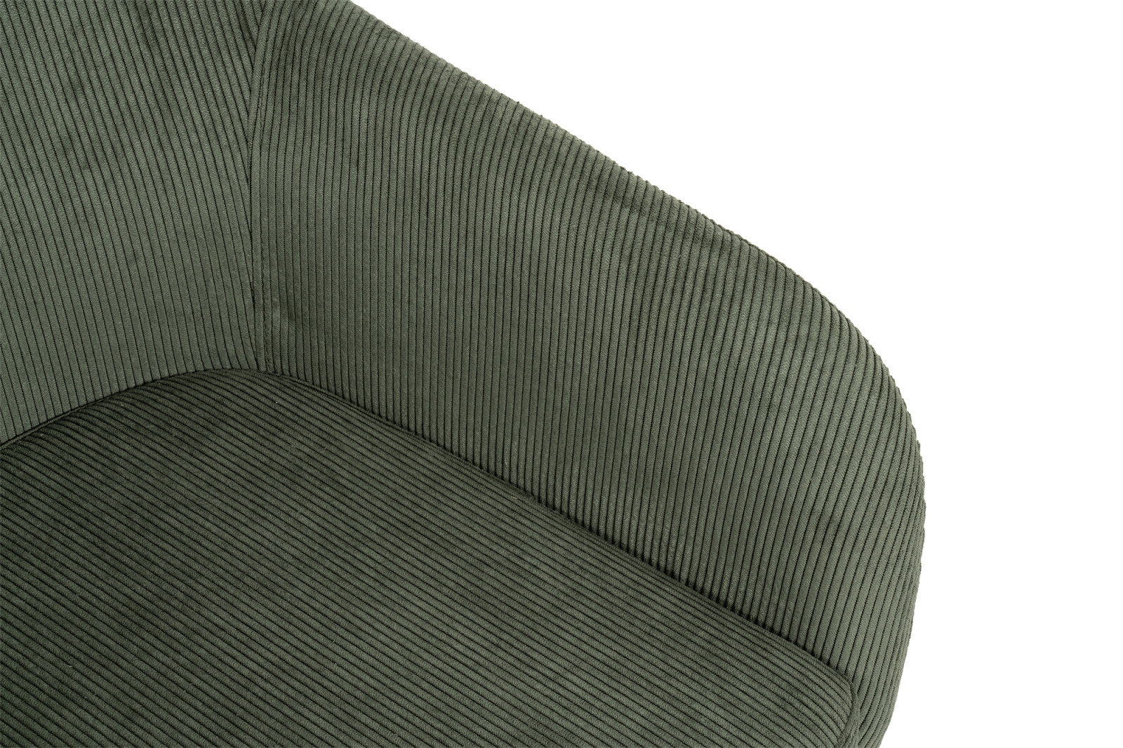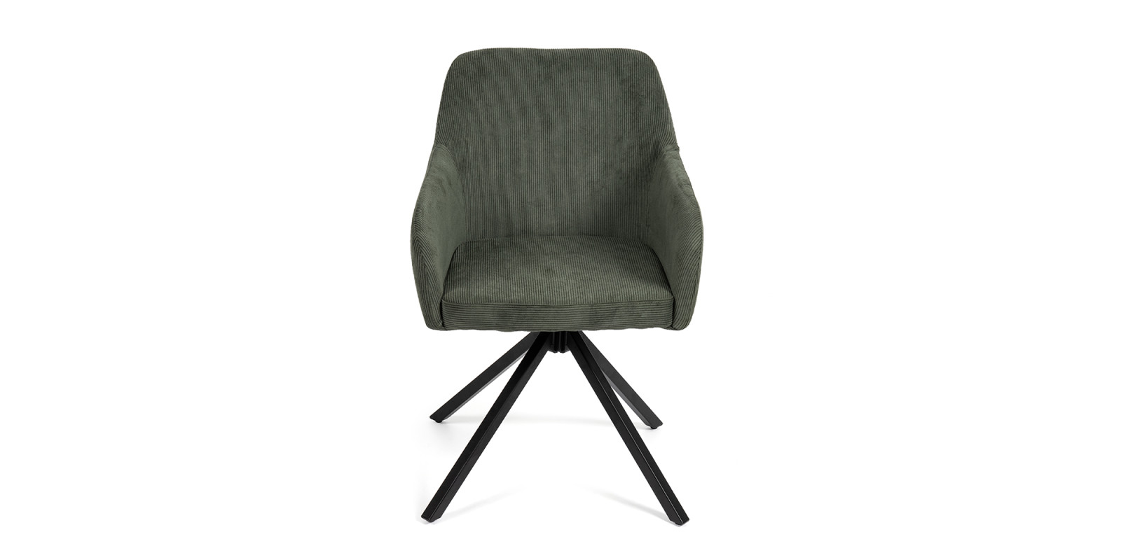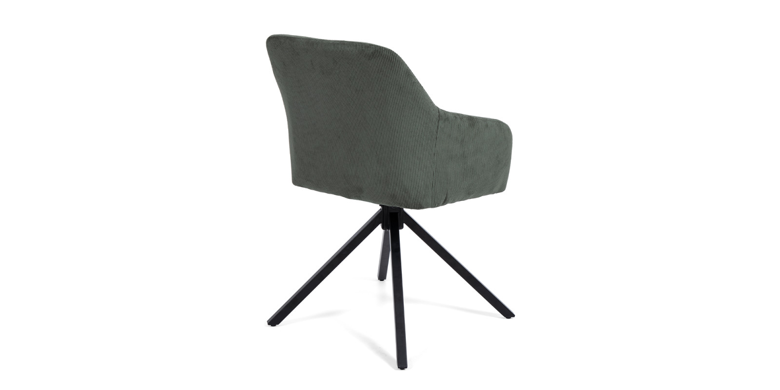 Stylová židle s područkami a moderním designem. Pohodlné čalounění v zelené manšestrové látce. Stabilní kovová podnož s otočnou funkcí. Vhodná do jídelny, pracovny i kanceláře. Spojuje komfort, praktičnost a elegantní vzhled.