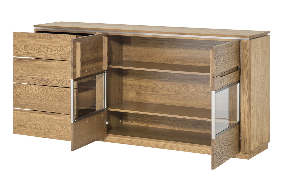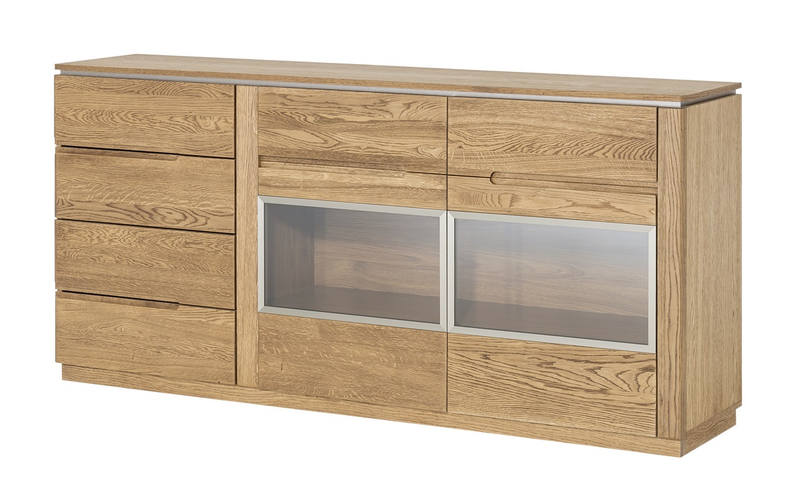 Komoda dvoudveřová prosklená. Jednoduché linie a kvalitní zpracování ve spojení s nadčasovým designem této řady dodají vaší jídelně nebo obývacímu pokoji jedinečný vzhled. Povrch vnějších částí je ošetřen olejem. Korpus je z vnější strany doplněn přírodní dubovou dýhou, vnitřní strana je z desky LTD v barvě přírodního dřeva. Komoda má v levé části 4 zásuvky, část s dvířky je prosklená. Dvířka jsou vyrobeny z masivního dubu rustikal. Úchyty jsou vyfrézované do přední desky. Možnost dokoupení LED osvětlení. Dodáváme již ve smontovaném stavu.
