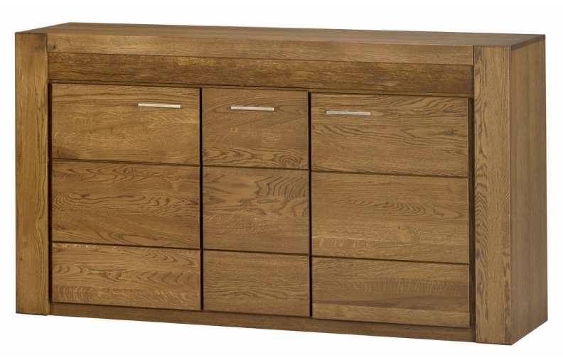 Komoda 3-dveřová. Vsazením osvětlení do ozdobné rýhované lišty, které je v ceně, je zvýrazněn rustikální vzhled masivního dřeva. Celá řada se vyznačuje elegancí a jednoduchými tvary, které zaručují plné využití prostoru. Nábytek je v barvě dub rustical, vyroben z kvalitního masivního dřeva, korpusy vnitřní jsou z lamina, korpusy vnější jsou z přírodní dýhy. Elegantní úchyty jsou z kovu. Dodáváme ve smontovaném stavu.