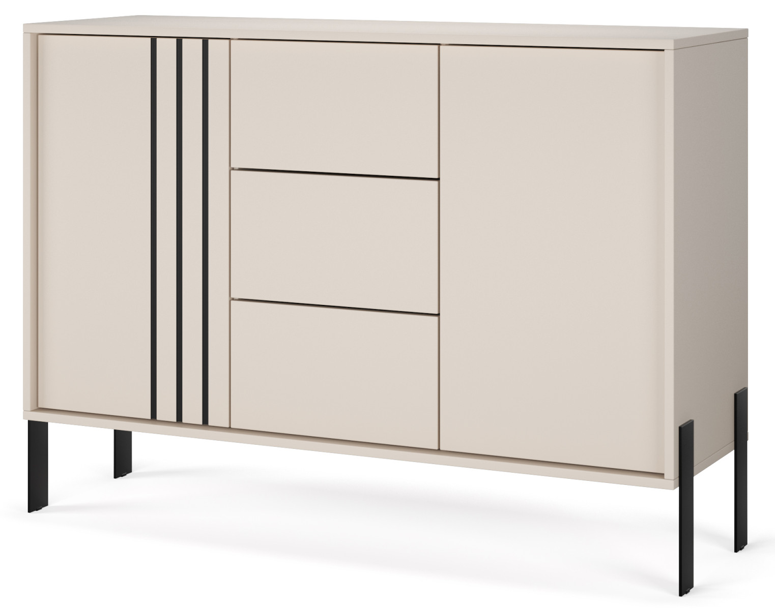 Charakteristickým prvkem kolekce jsou dekorativní černé lišty na čelních plochách a stabilní kovové nohy, které dodávají nábytku optickou lehkost a podtrhují jeho moderní styl.