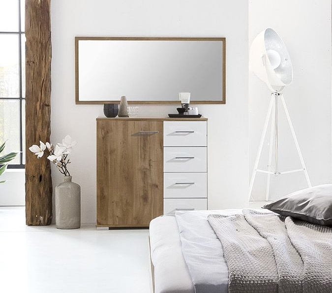 Komoda v krásném elegantním provedení z ložnicové kolekce PAMELA. Komoda má 1 dvířka a 4 praktické zásuvky.Korpus i dvířka jsou z kvalitní LTD v barvě divoký dub ( dubové prkna ) v kombinaci s alpskou bílou. Ložnicová sestava PAMELA se skládá z několika různých prvků nábytku a to Vám dává možnost sestavit si ložnici podle svých vlastních představ. Dodáváme v demontovaném stavu.