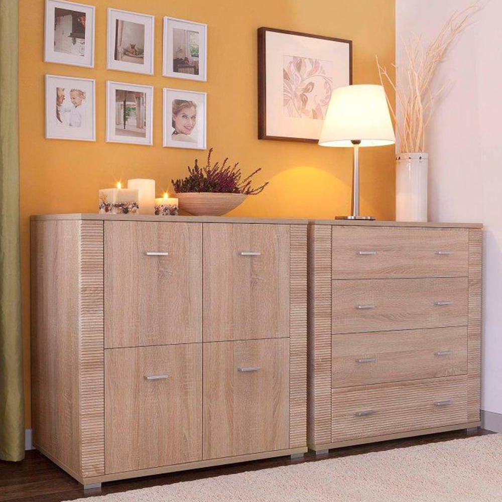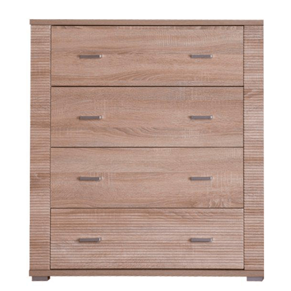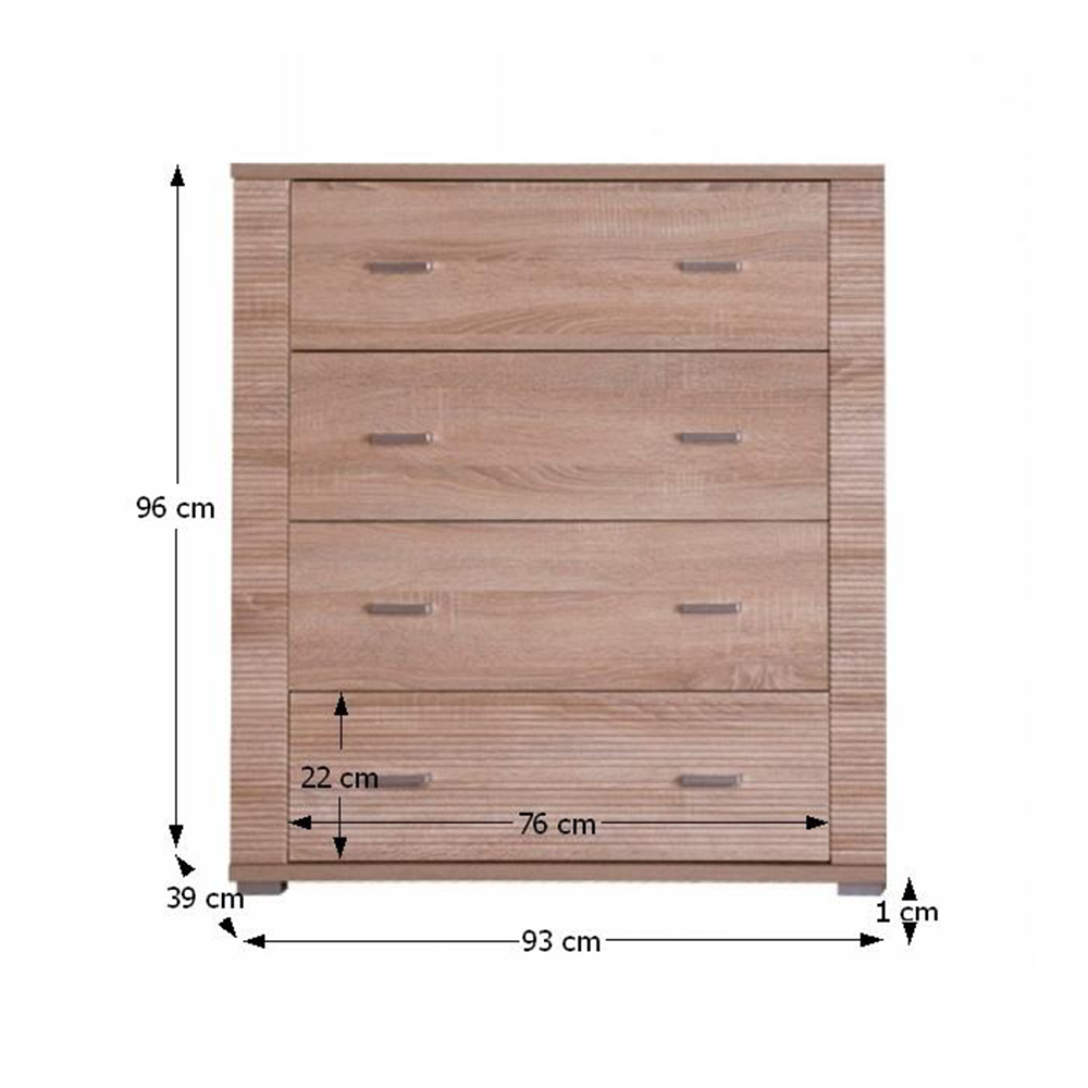 Komoda se 4 zásuvkami typ 11, vhodný na zařízení obývacích pokojů, ložnic i pracoven, materiál: DTD laminovaná. Hrany jednotlivých komponentů jsou ukončeny vroubkovanou lištou. Barevné provedení: dub sonoma. Rozměry (ŠxVxH): 93x96x39 cm.