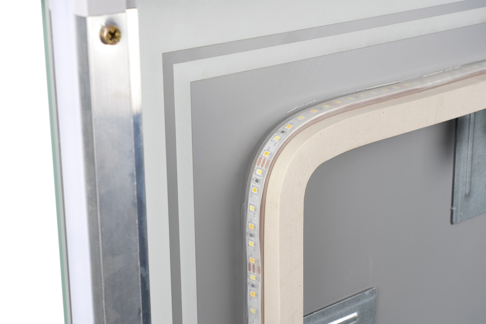 Zrcadlo s LED podsvícením. 70x90 cm, hliníkový rám s plastovým krytem, 3 úrovně teploty barvy světla.