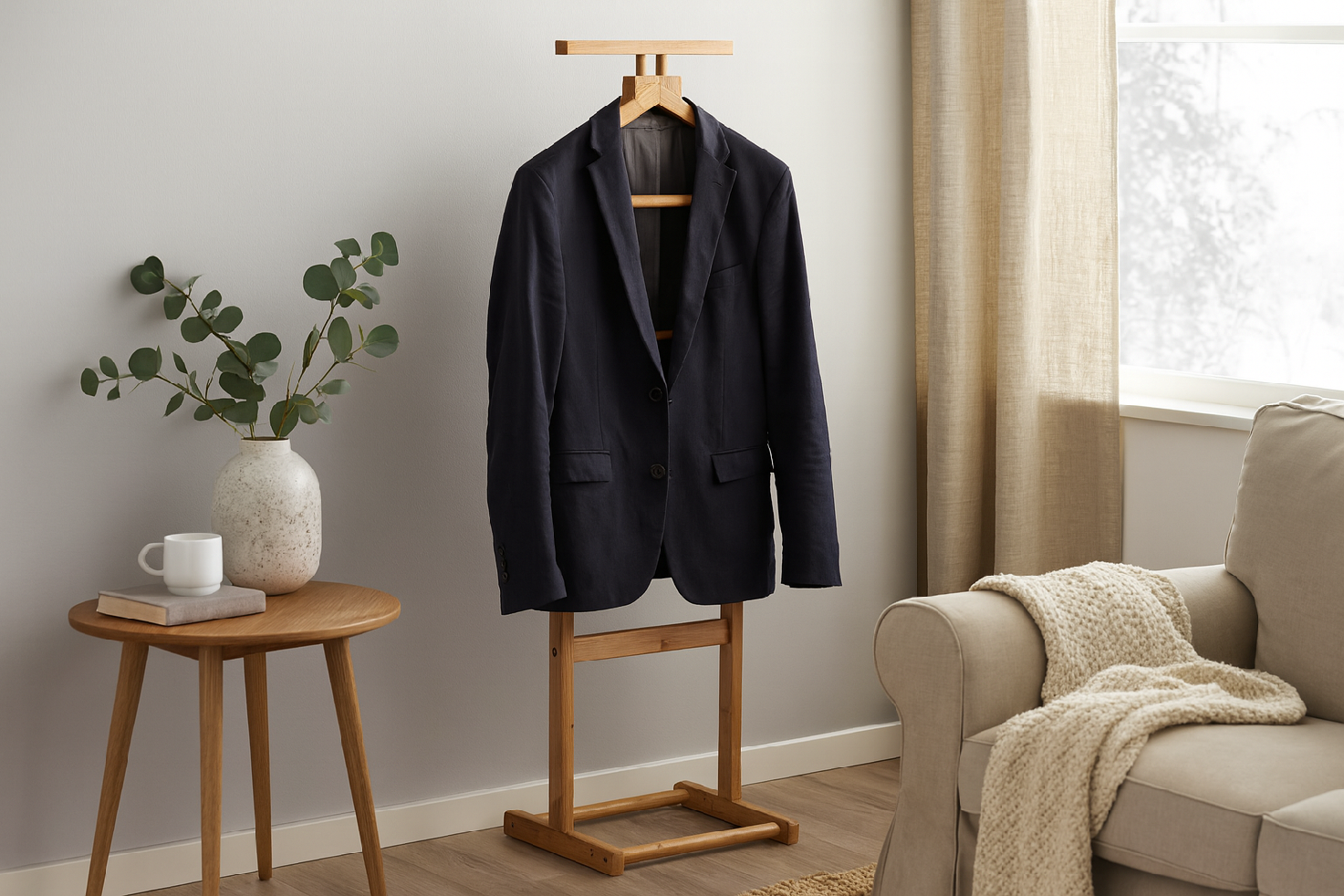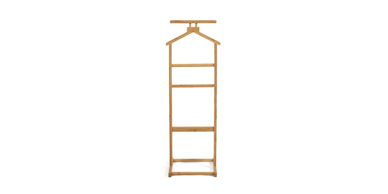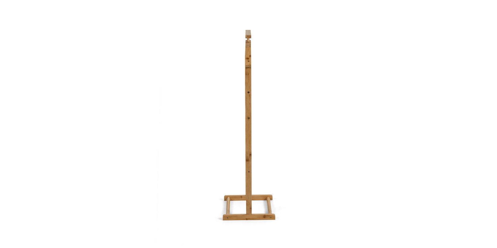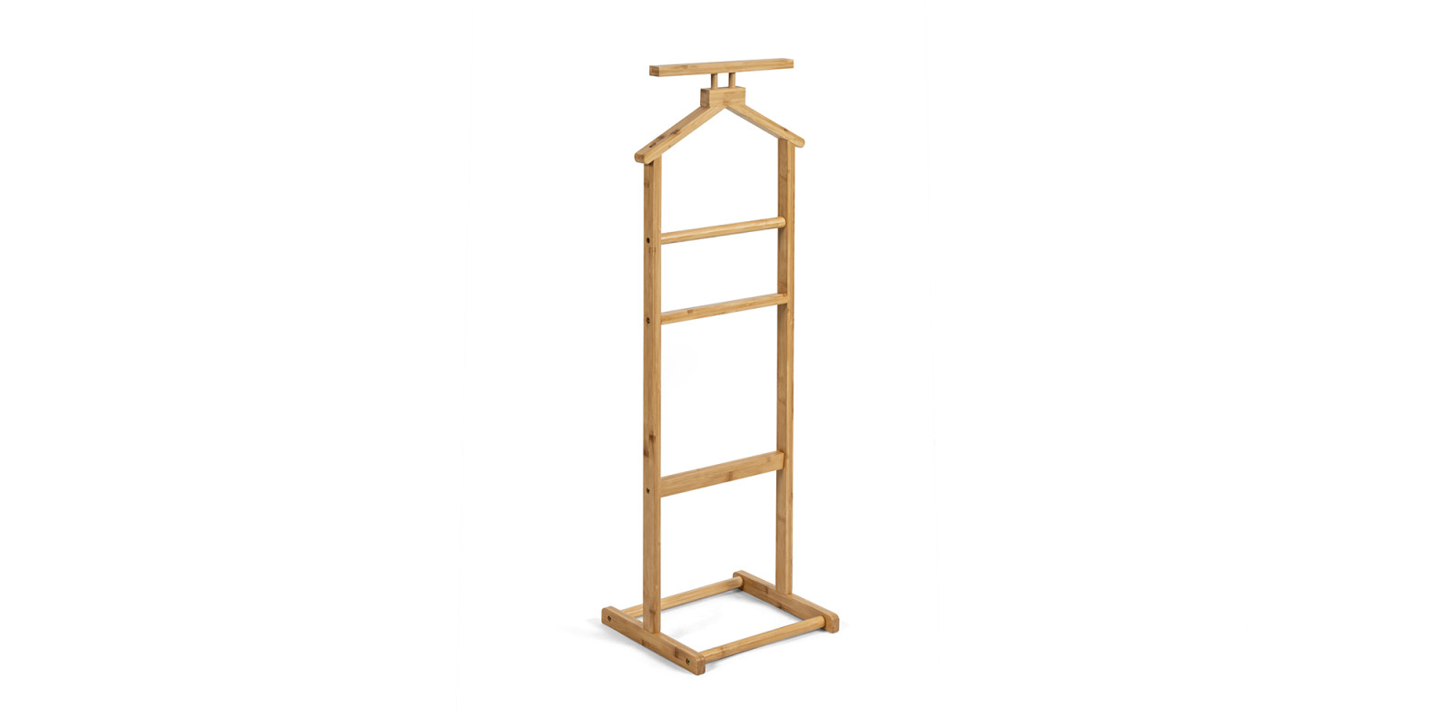 Praktický stojanový věšák na oblečení s nadčasovým designem. Vybavený horním ramínkem na sako či košili a tyčemi na kalhoty či doplňky. Stabilní základna zajišťuje pevnost a odolnost. Ideální do ložnice, šatny nebo předsíně. Spojuje funkčnost, jednoduchost a elegantní vzhled.