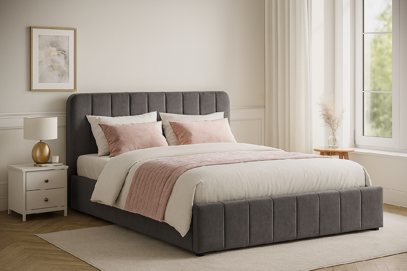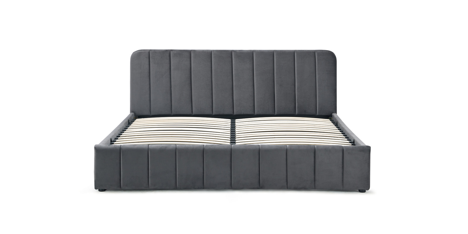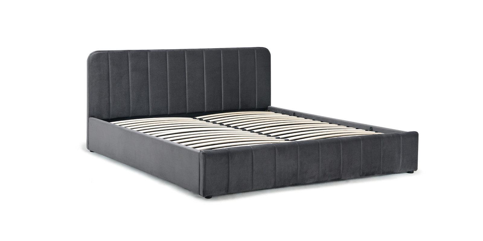 Kvalitní konstrukce a pevné materiály zaručují dlouhou životnost a stabilitu, zatímco sametový potah v šedém odstínu vnese do ložnice pocit útulnosti a stylu.