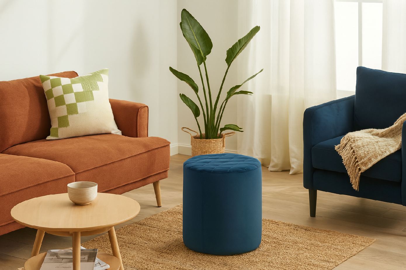 Elegantní kulatá taburetka čalouněná jemnou sametovou látkou v moderním odstínu tmavě modré barvy. Vrchní část sedáku je zdobena decentním prošíváním do kosočtverců, které dodává nábytku sofistikovaný vzhled. Díky kompaktním rozměrům je taburetka lehká, snadno přemístitelná a zároveň dostatečně stabilní pro každodenní použití.