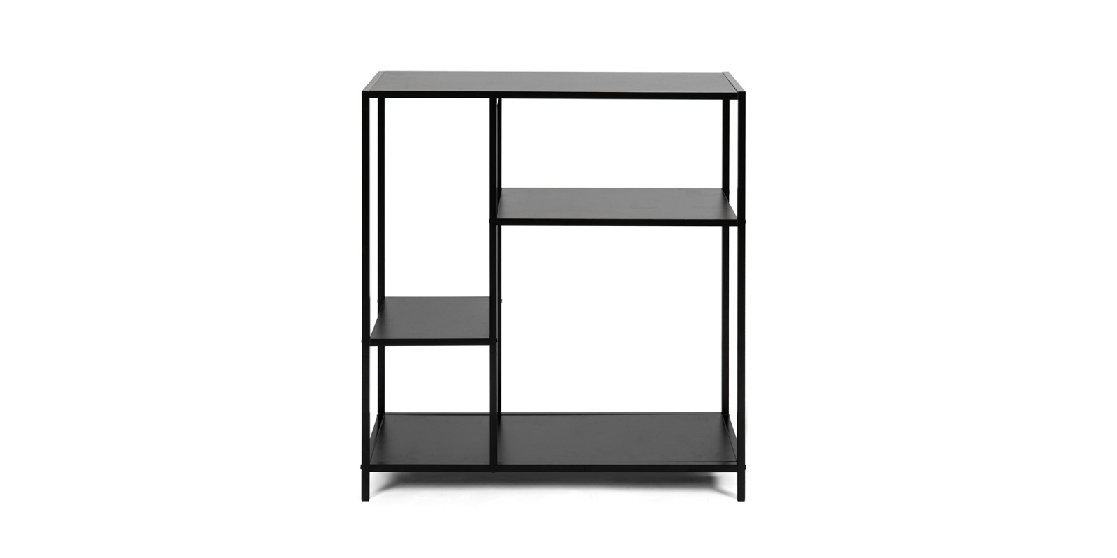 Praktický otevřený regál s kovovým rámem a policemi nabízí funkční úložný prostor s odlehčeným vzhledem. Díky asymetrickému rozložení polic působí zajímavě a zároveň poskytuje místo pro knihy, dekorace nebo doplňky.