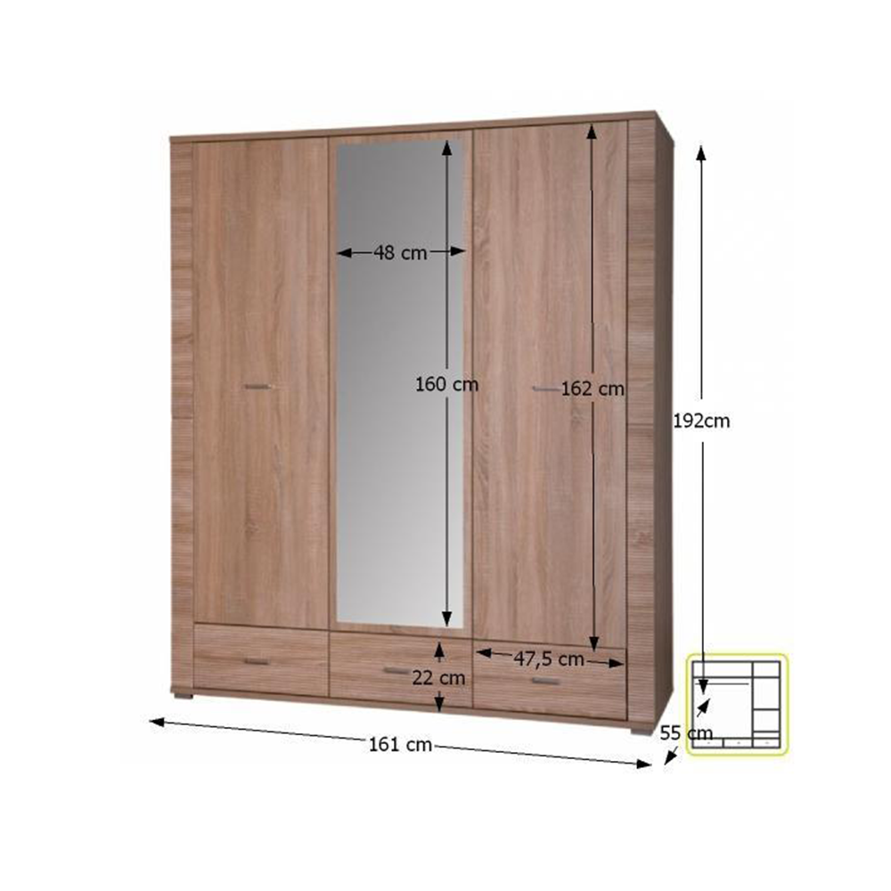 Skříň věšáková typ 02, se třemi policemi a třemi zásuvkami, vhodná na zařízení obývacích pokojů, ložnic i pracoven, materiál: DTD laminovaná. Hrany jednotlivých komponentů jsou ukončeny vroubkovanou lištou. Barevné provedení: dub sonoma. Rozměry (ŠxVxH): 161x192x55 cm. Tloušťka materiálu korpus: 16 mm