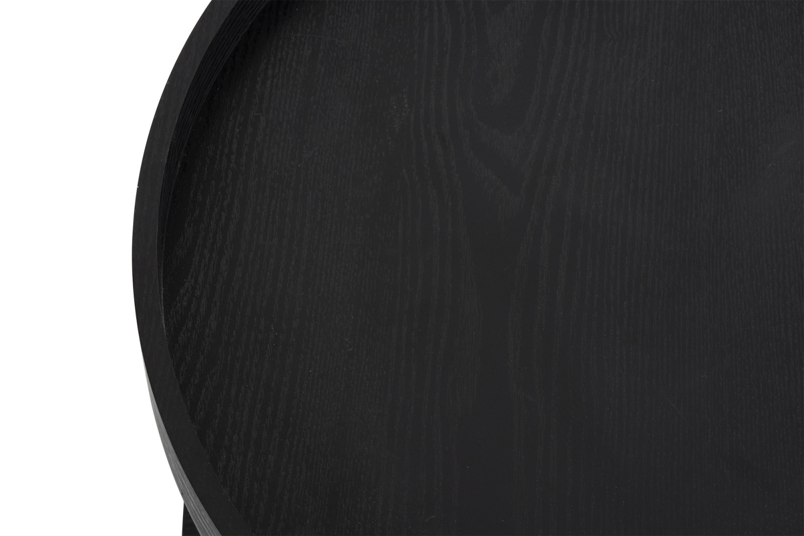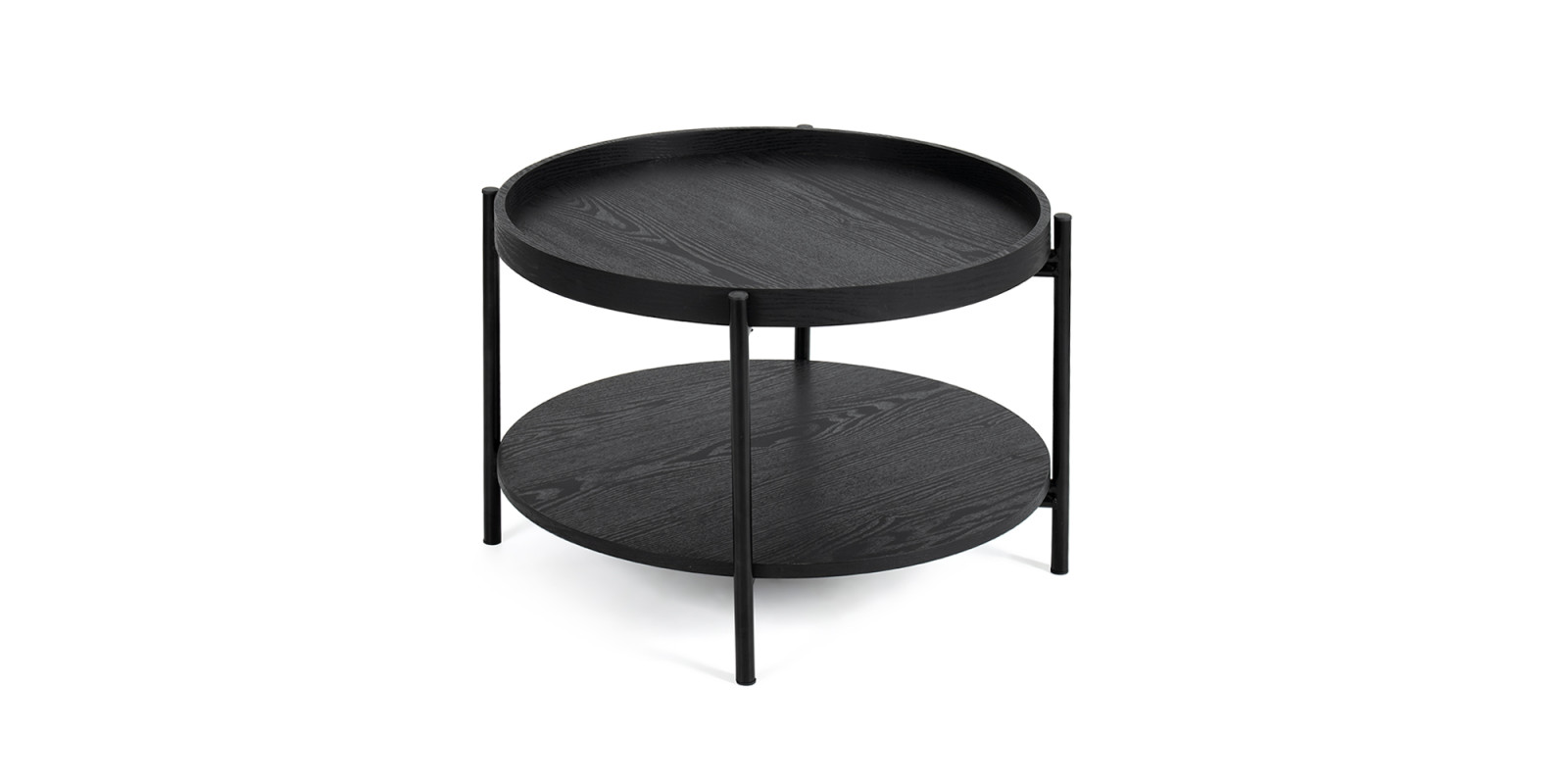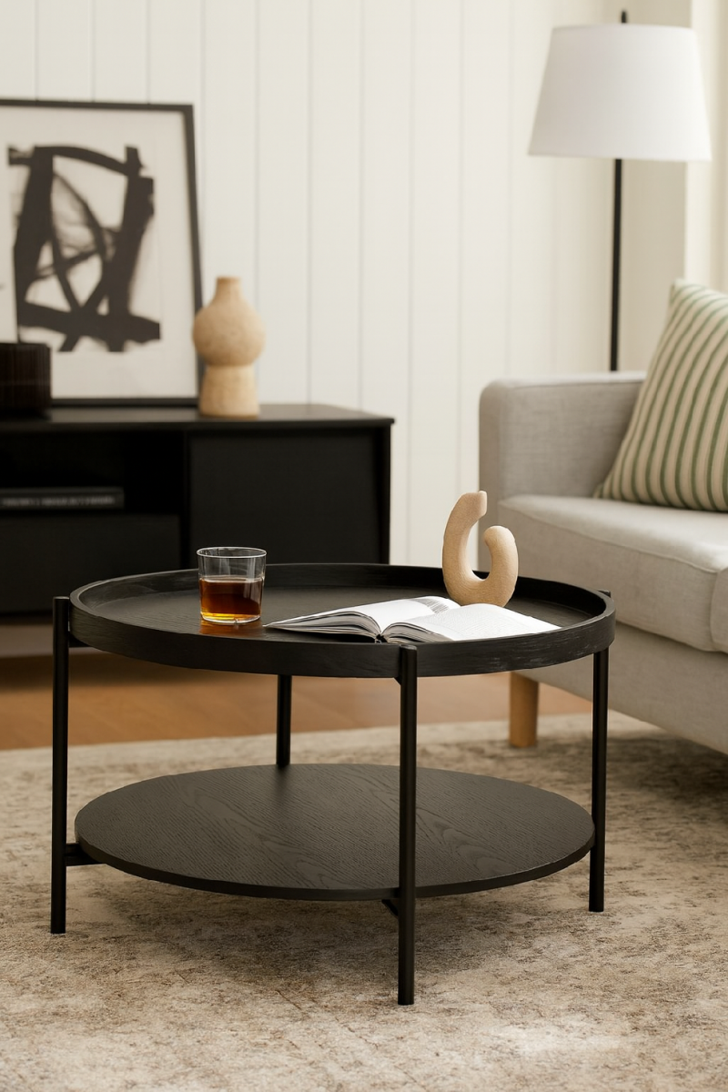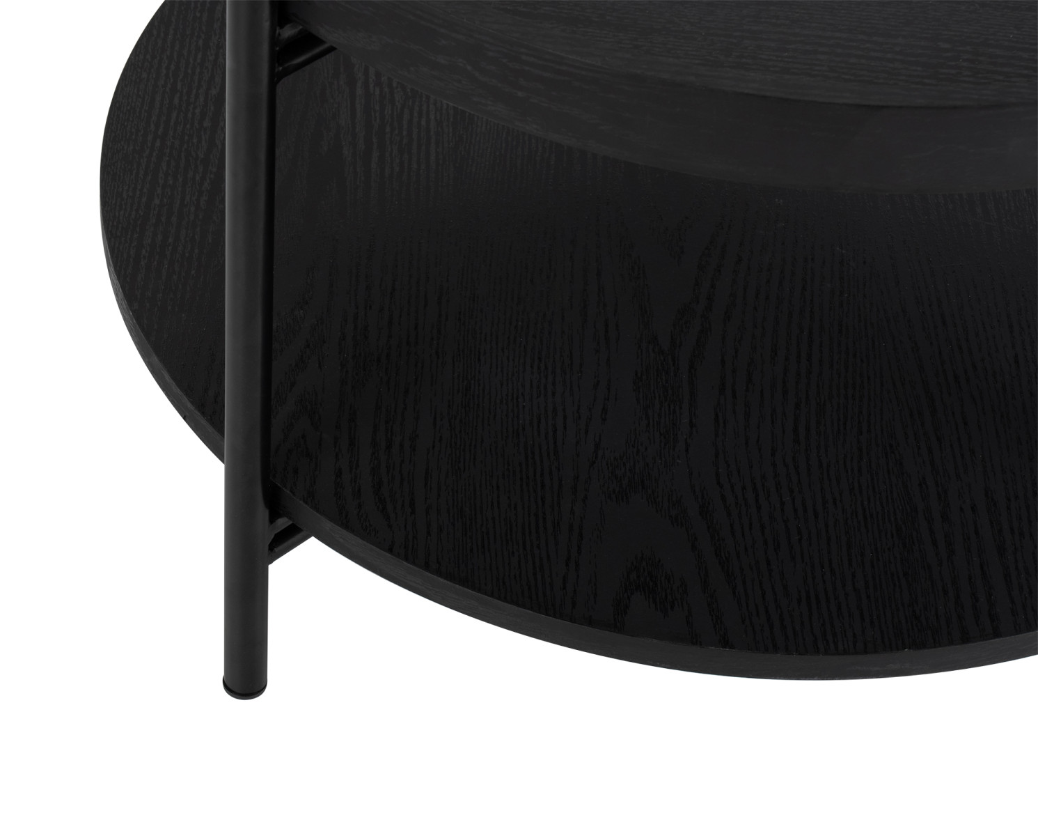 Kulatý konferenční stolek s moderním minimalistickým designem. Dvě odkládací plochy v černém dekoru dřeva pro maximální praktičnost. Stabilní kovová konstrukce v černém provedení. Vhodný do obývacího pokoje či stylové pracovny. Spojuje eleganci, funkčnost a nadčasový vzhled.