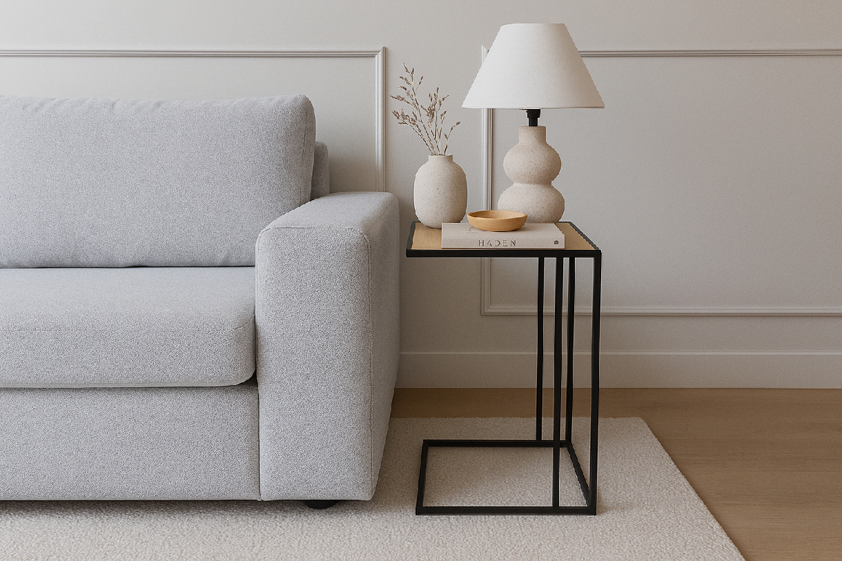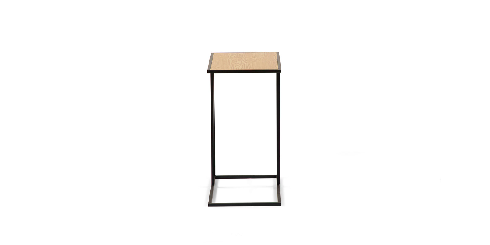 Odkládací stolek, MDF deska v přírodní barvě a ocelové podnoží v černé barvě.