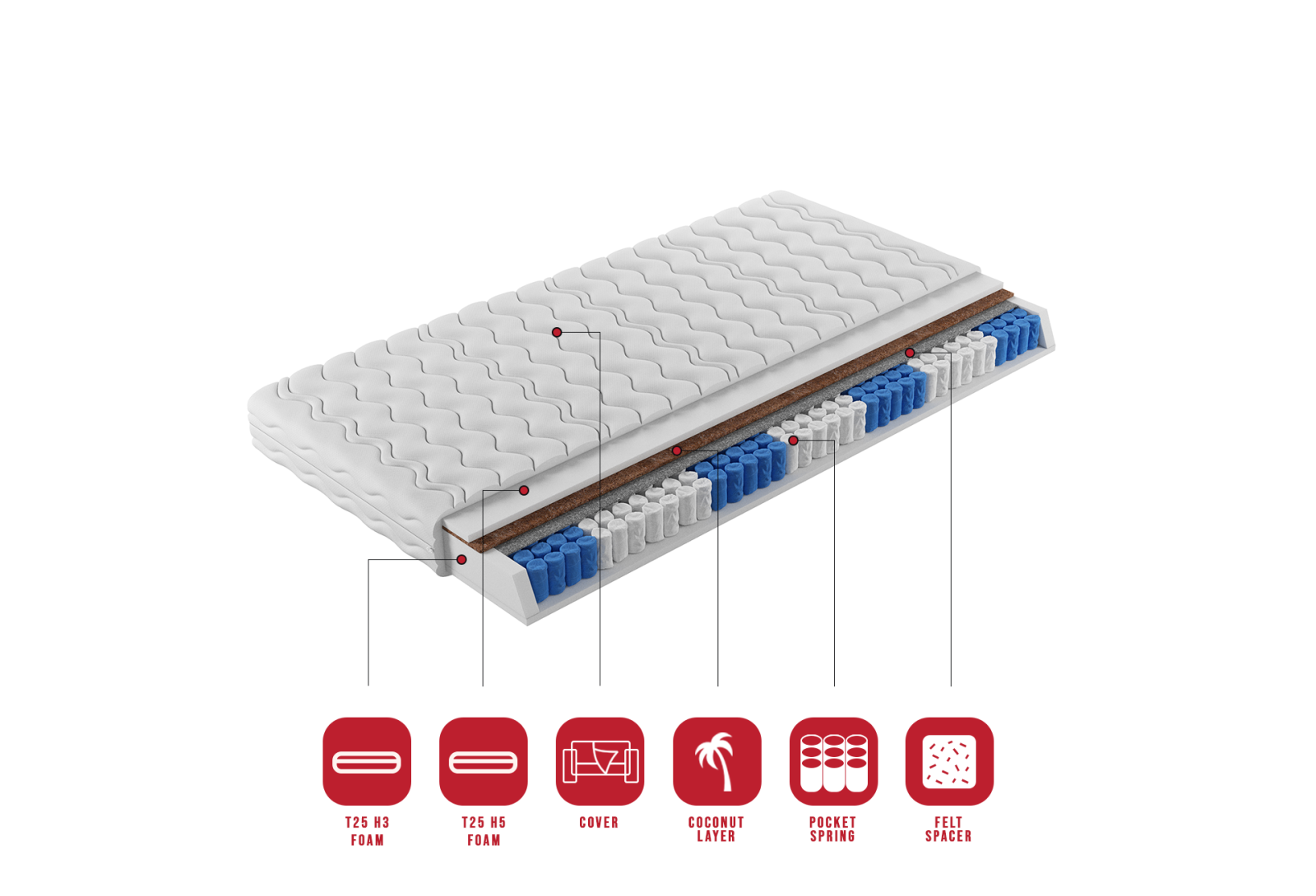 Foam T25; Pocket Spring; Felt; Coconut Mat