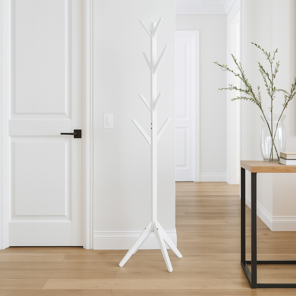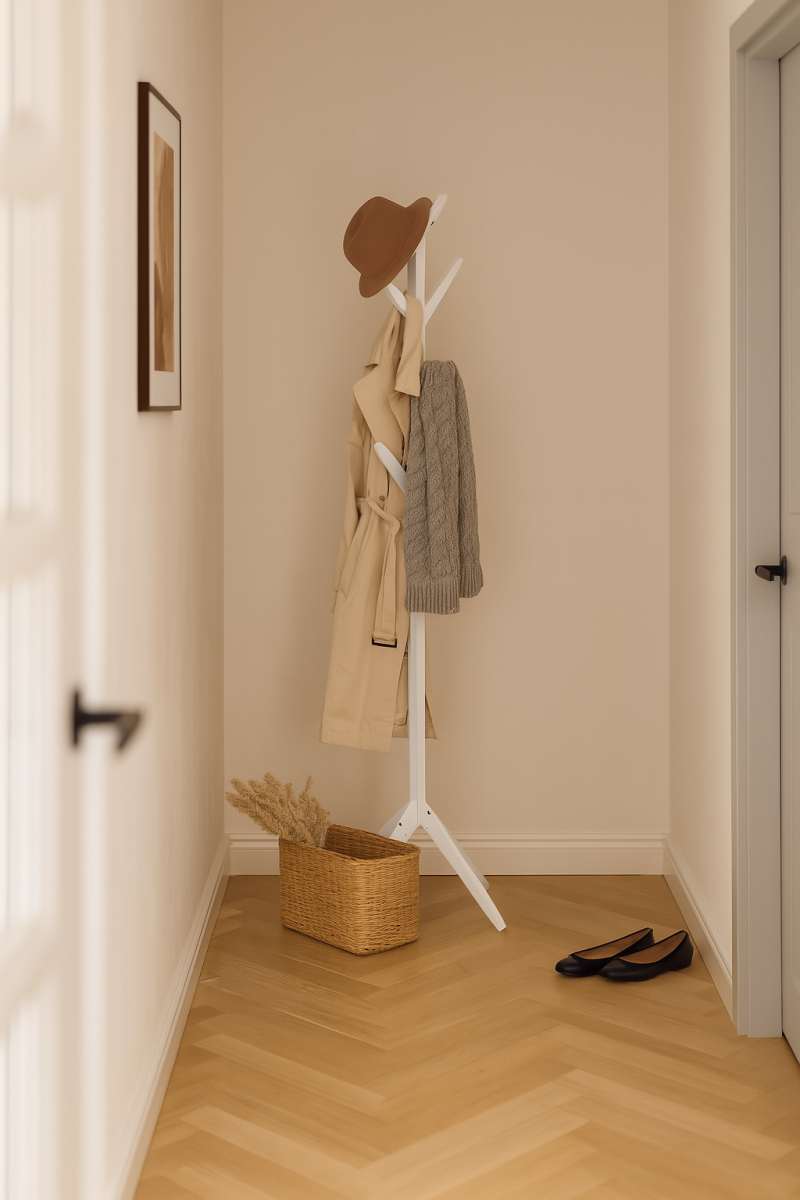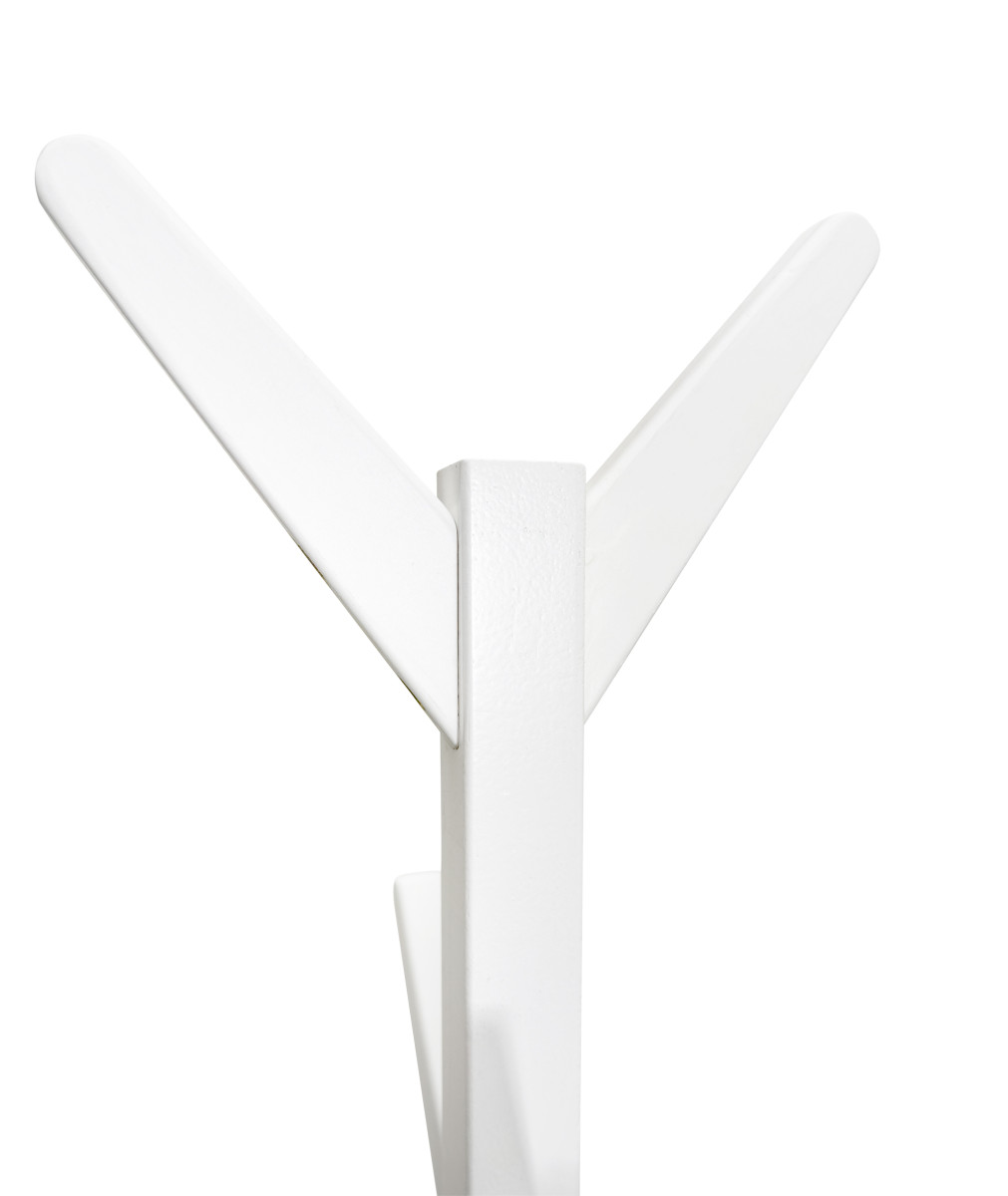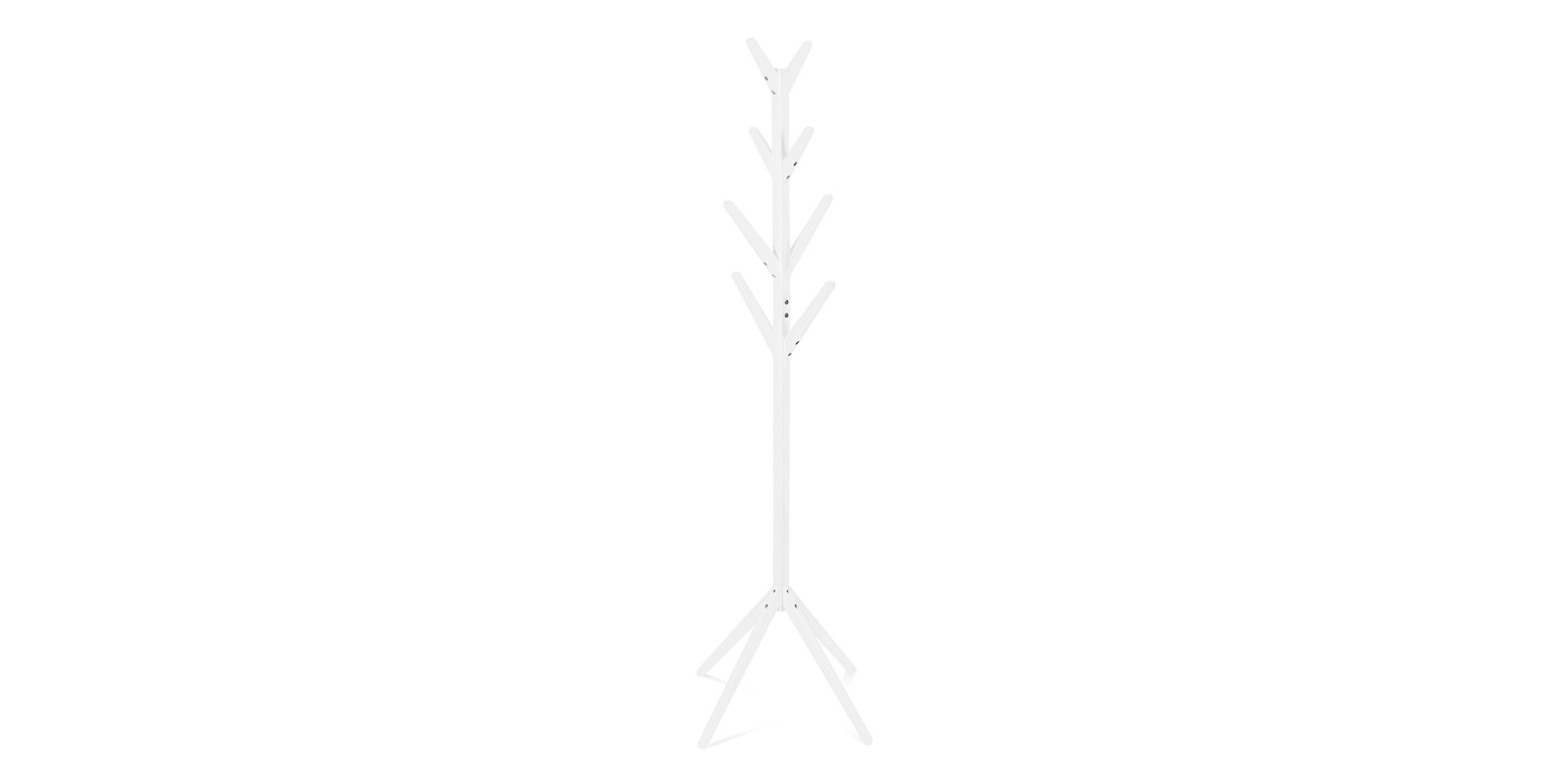 Moderní stojanový věšák s minimalistickým designem. Více háčků pro pohodlné zavěšení oblečení či doplňků. Stabilní základna zajišťuje pevnost a odolnost