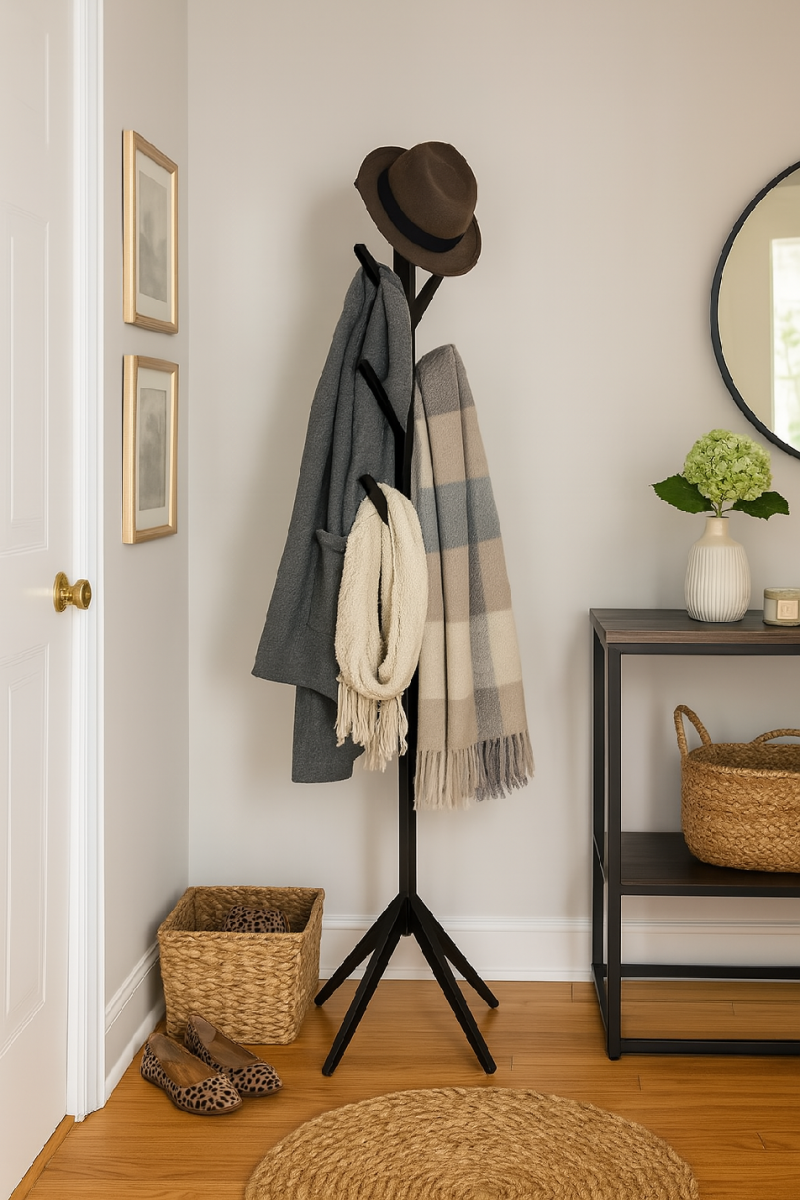 Věšák nabízí několik háčků uspořádaných po celé výšce stojanu, což umožňuje zavěšení kabátů, bund, kabelek i doplňků.